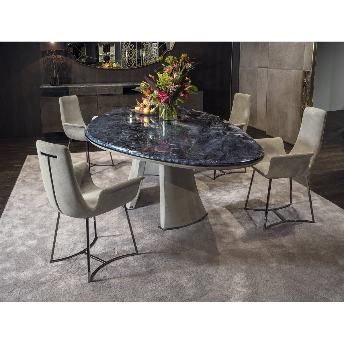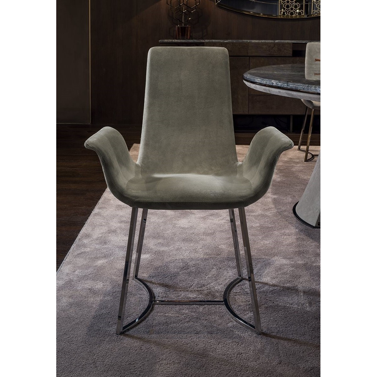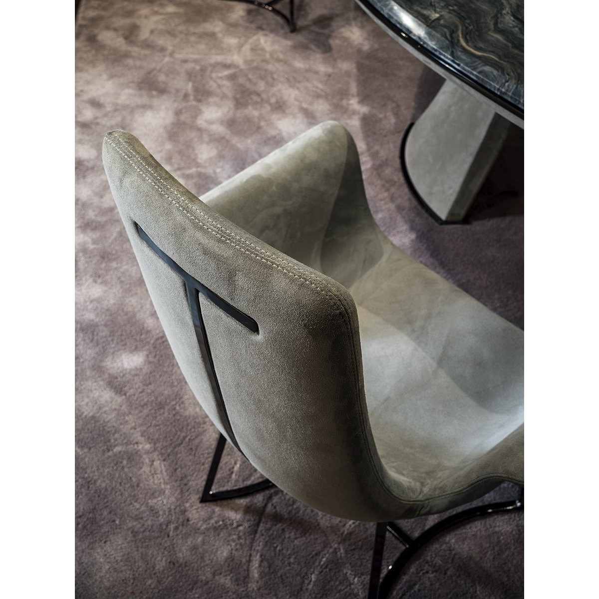 The internal metal structure is cold-moulded in foam. The base and elegant backrest support are in metal, available in the following galvanised finishes: Satin nickel, bright shaded brown, bright light gold, matt Champagne gold, bright chrome, bright black chrome, matt satin bronze, bright pink gold, matt pink gold,Black Rose gold. The upholstery is glued to the chair, and therefore not removable.