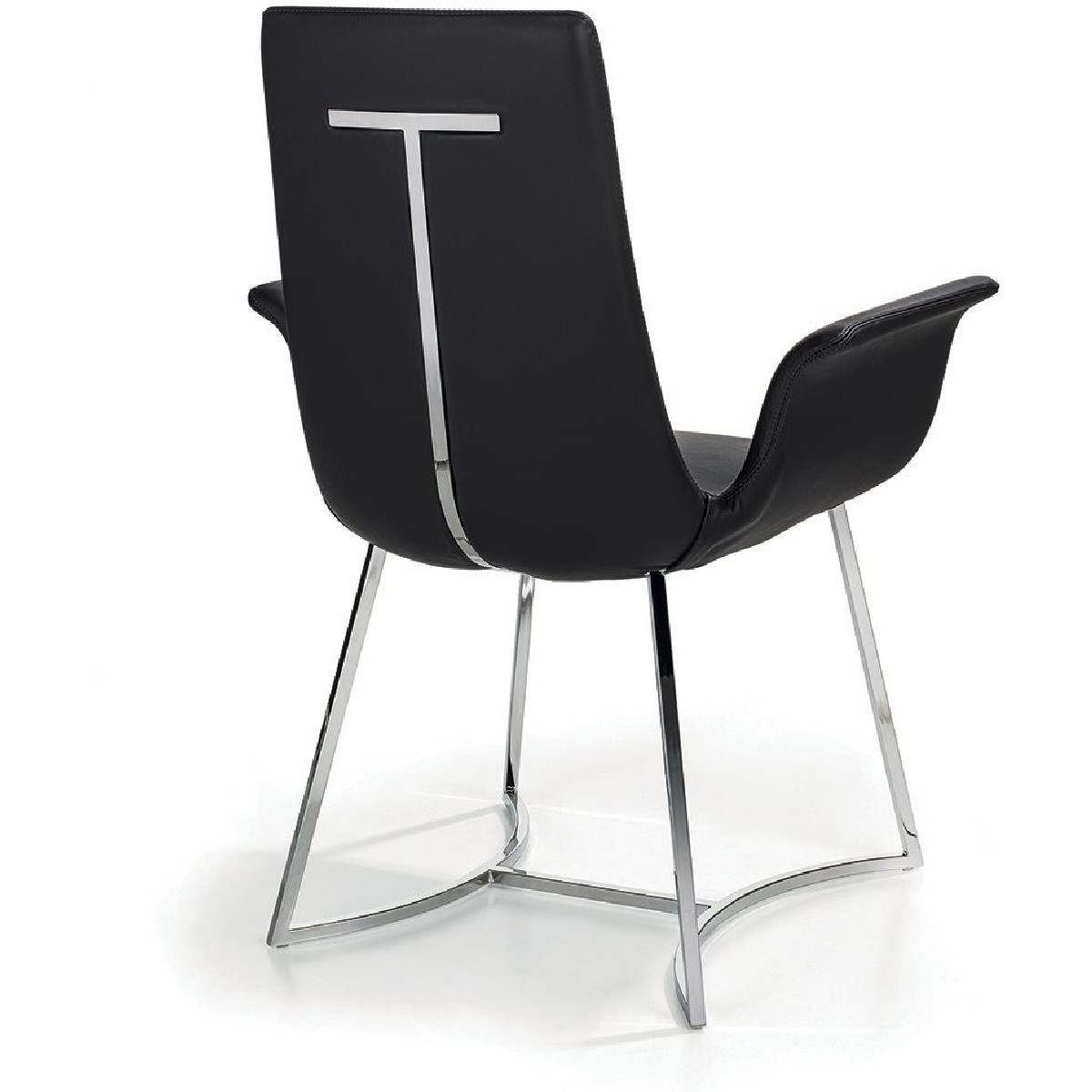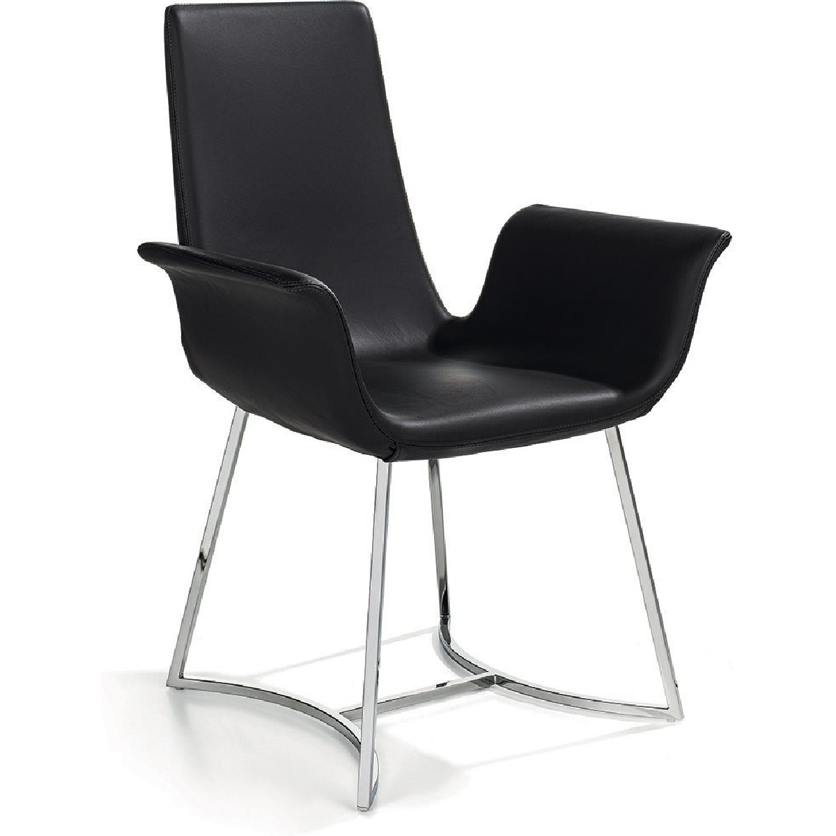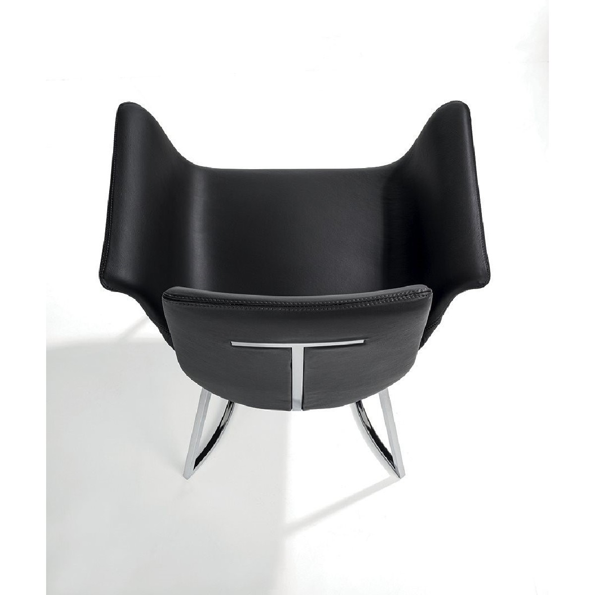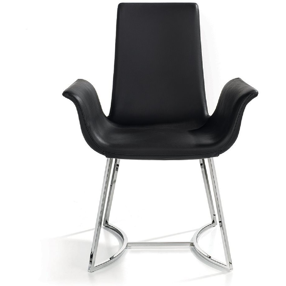 This chair has a metal base and leather-upholstered frame with a continuous, fluid and extremely natural shape. Its plastic forms blend into a single symphony that creates a comfortable volume resembling a flower with three petals. The backrest is supported by a metal insert.