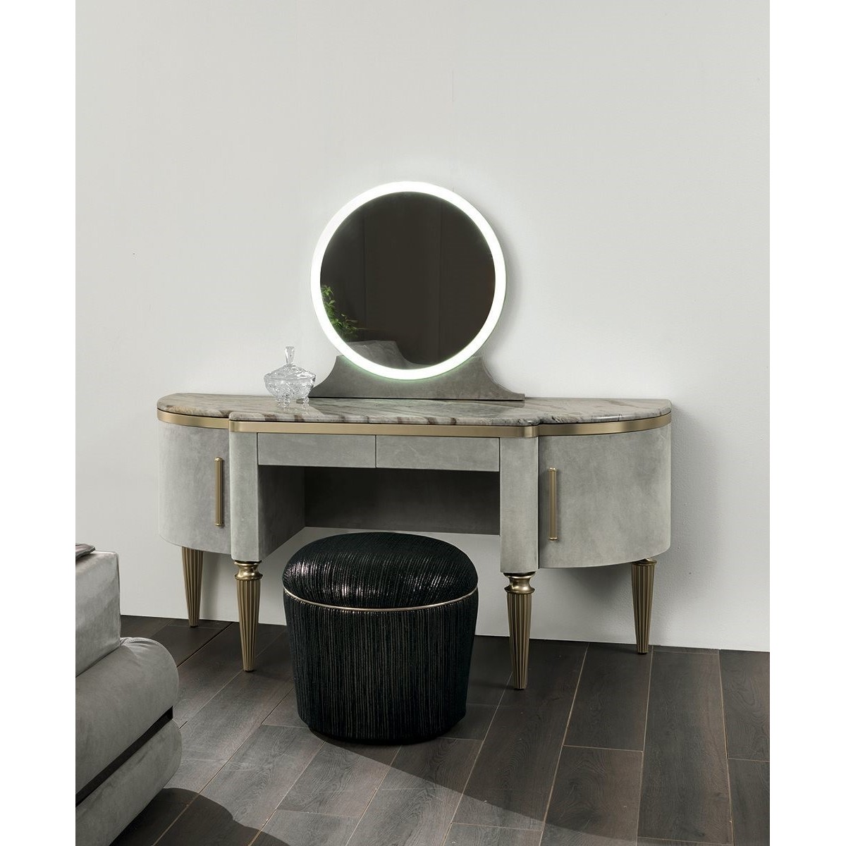 Make-up cabinet with wood structure covered in leather from the range, comprising two central drawers and two curved side doors. Undertop edge in metal or covered in leather from a category in the range. Legs and handles in grooved metal in the finishes:- Black Rose gold,- bright shaded brown, bright light gold,- matt Champagne gold,- bright chrome,- bright black chrome,- matt satin bronze,- bright pink gold,- matt pink gold.Shaped marble top, 20 mm thick, with half bullnose rounded edge:- Portoro marble, - Fusion Light marble, - Patagonia marble, - Explosion Blu marble, - Fusion Multicolor marble, - Juliet quartz marble,- Calcite Azul marble,- Sahara Noir marble (polyester finish),- Dover White marble,- Panda White marble,- Guatemala Green marble,- Corteccia marble,- Port Saint Laurent marble,- Red Levanto marble,- Bardiglio Nuvolato marble,- Elegant Brown marble,- Shale Rosewood marble,- Emperador Dark marble,- Silver Wave marble,- Agatha Black marble,- Frappuccino marble,- Calacatta marble.Round mirror with base covered in leather like the vanity, metal edge, dimmable LED lighting strip on the mirror perimeter.