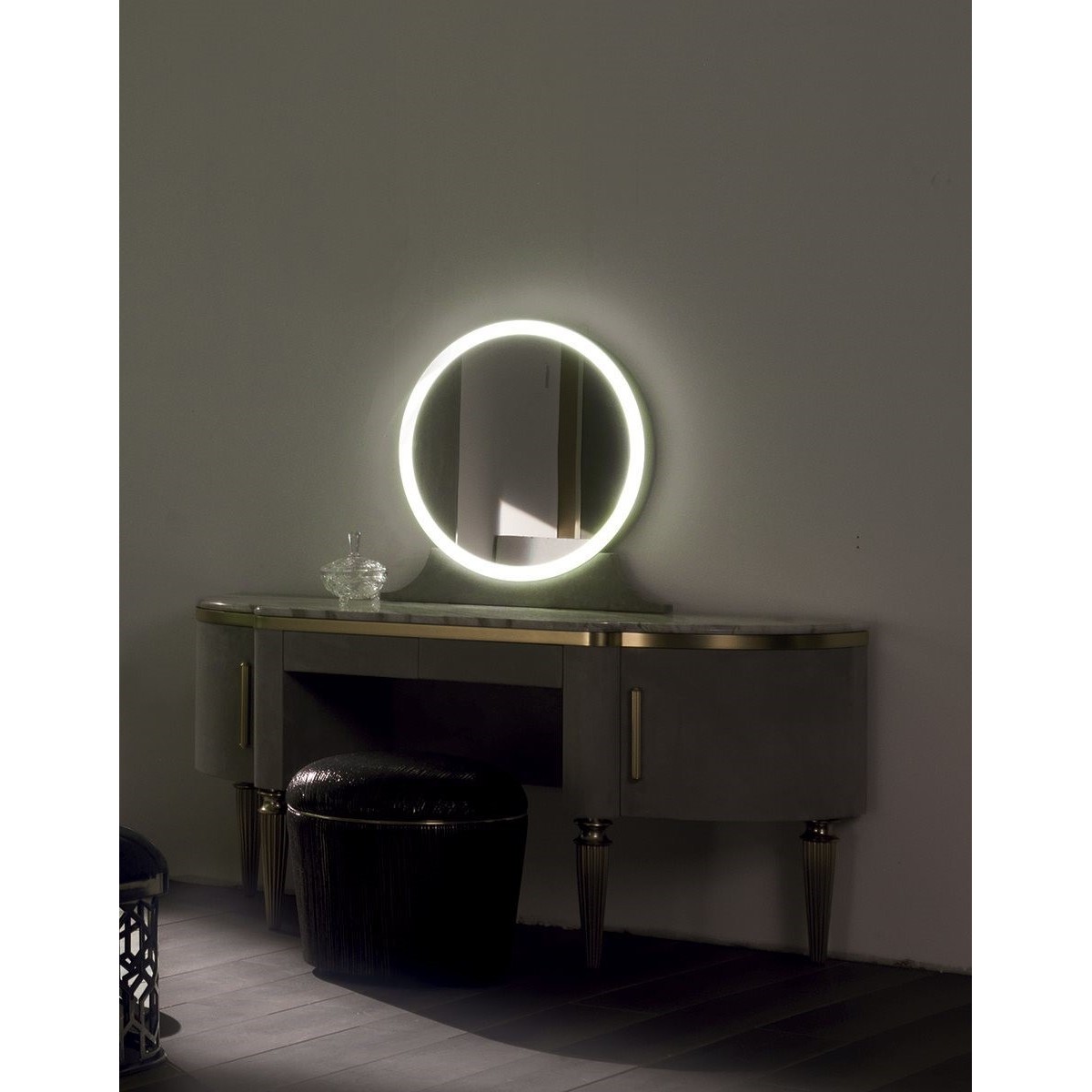 A practical make-up table with doors and small drawers, Dame is the perfect beauty station for the bedroom. With its soft lines and neoclassical style, the piece incorporates a round mirror and LED lightin.