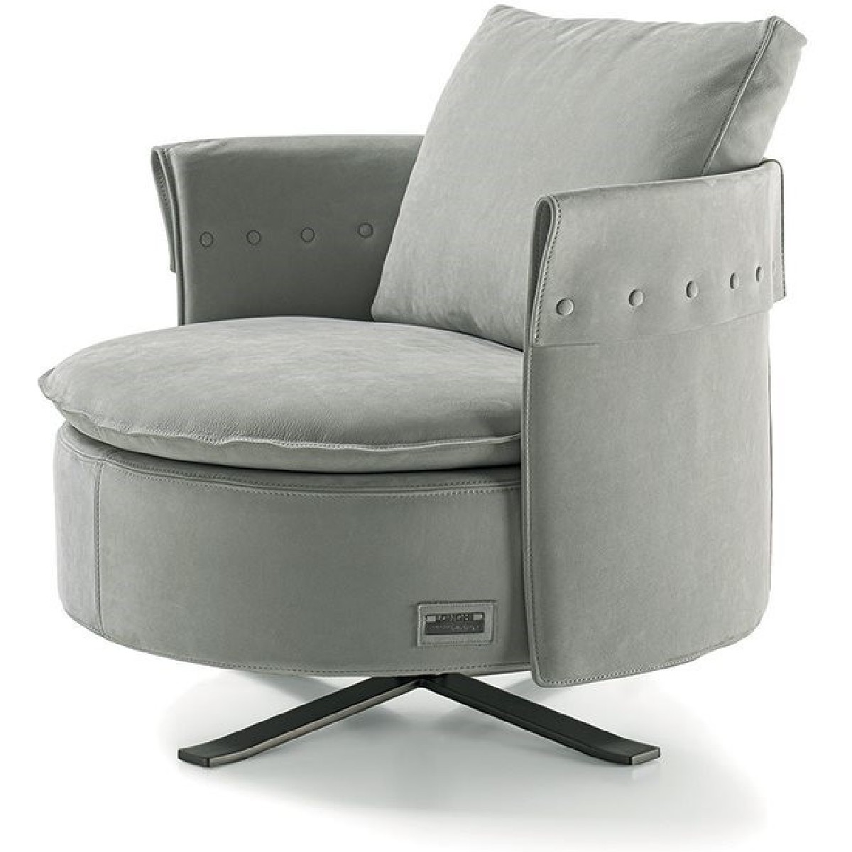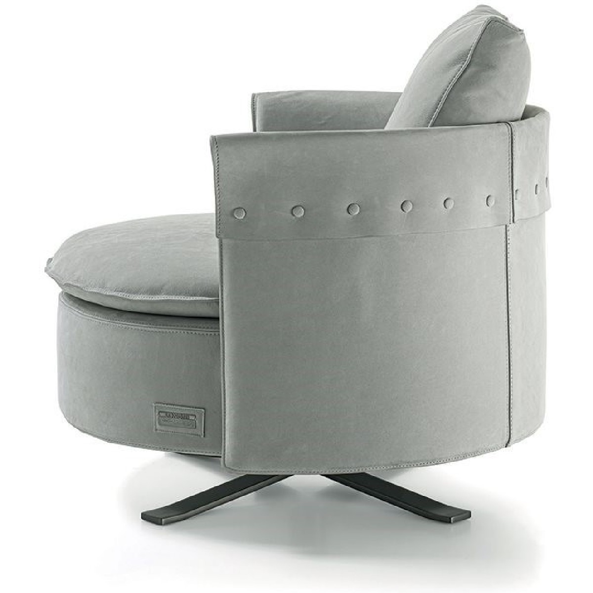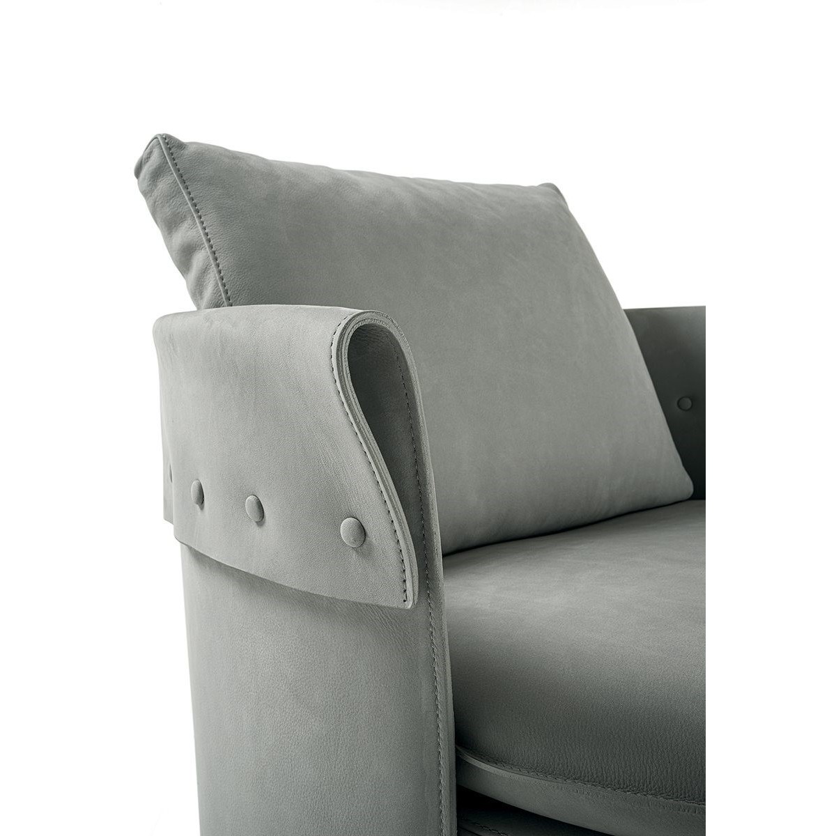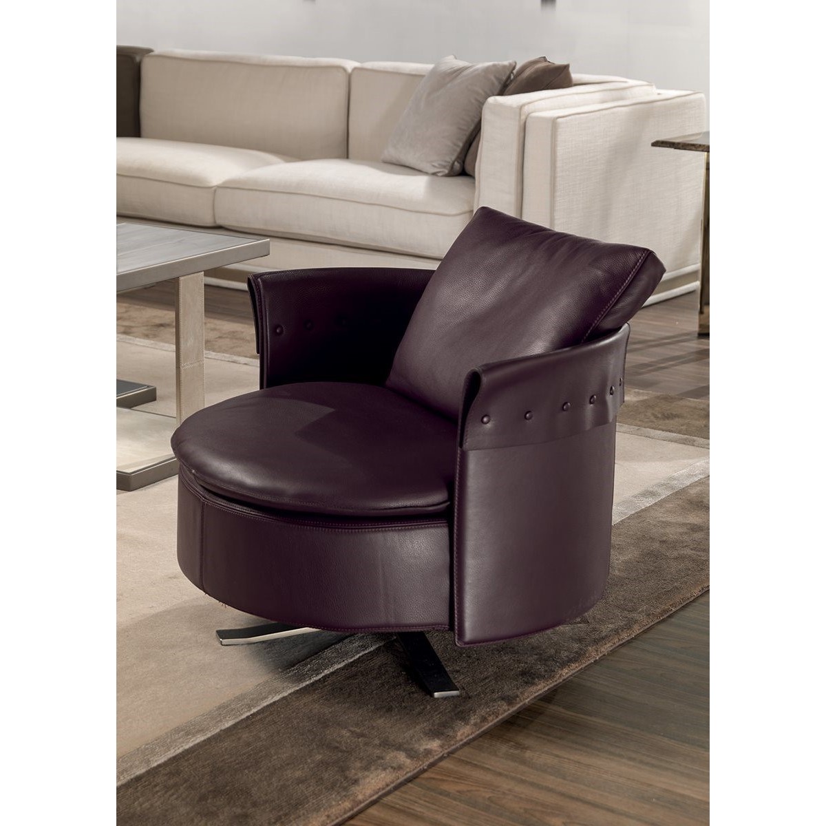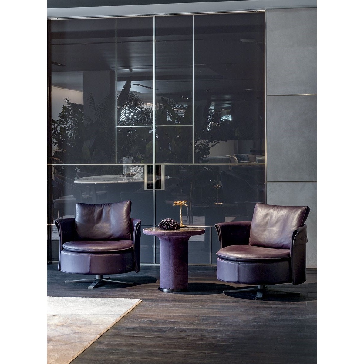 An important armchair on a swivel base, a “must” for the Loveluxe collection, Charme is a rich product with an essential line that entrusts the expressive impact of the project mainly to the precious materials used to make it. The backrest is an elegant, enveloping frame covered in leather that continues into the armrests, slightly widening on the ends and closed with leather-covered buttons to form a small fold like a light origami. The Charme bed and sofa were made following the success of this armchair.
