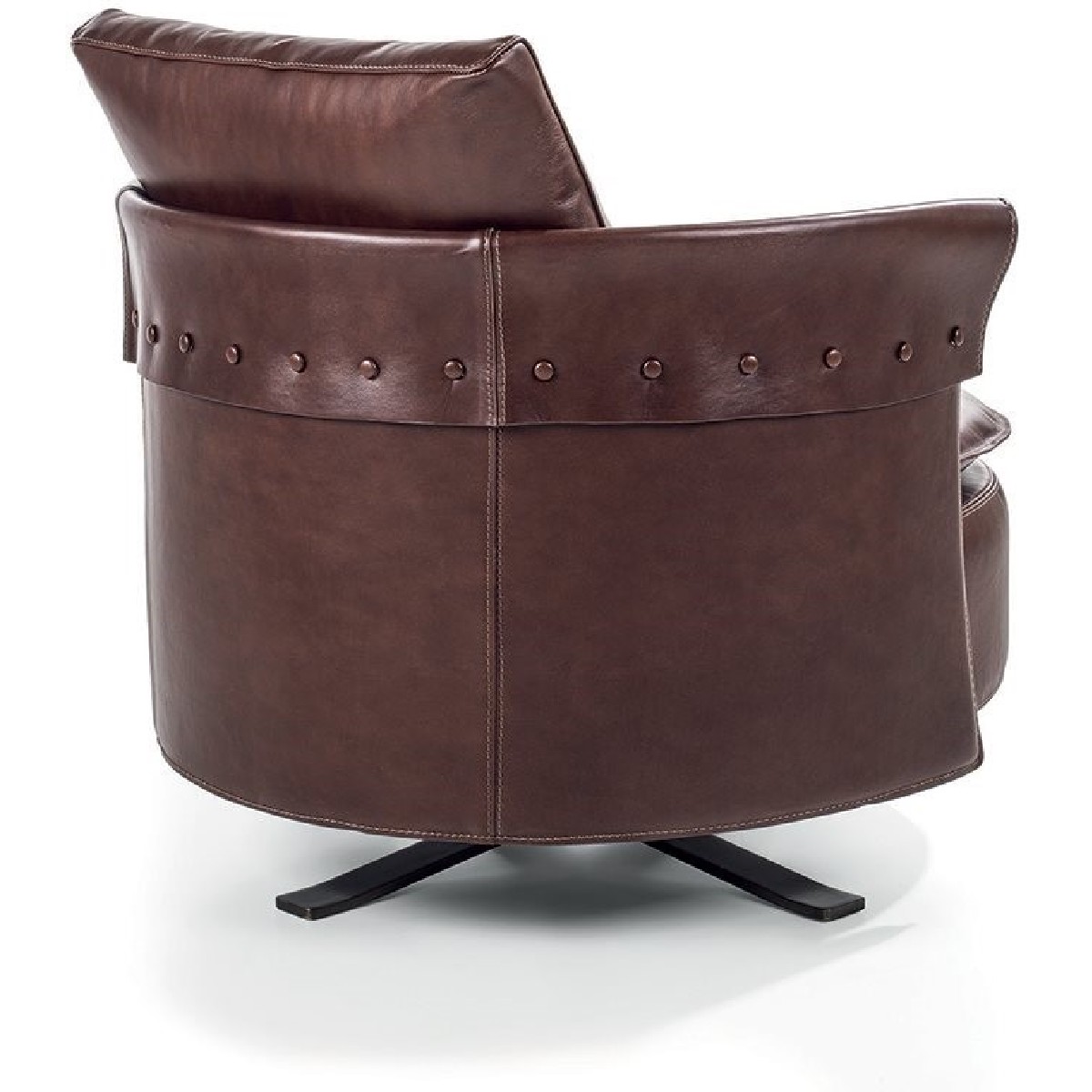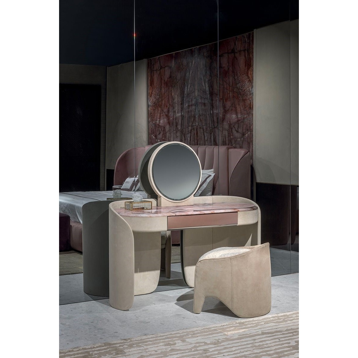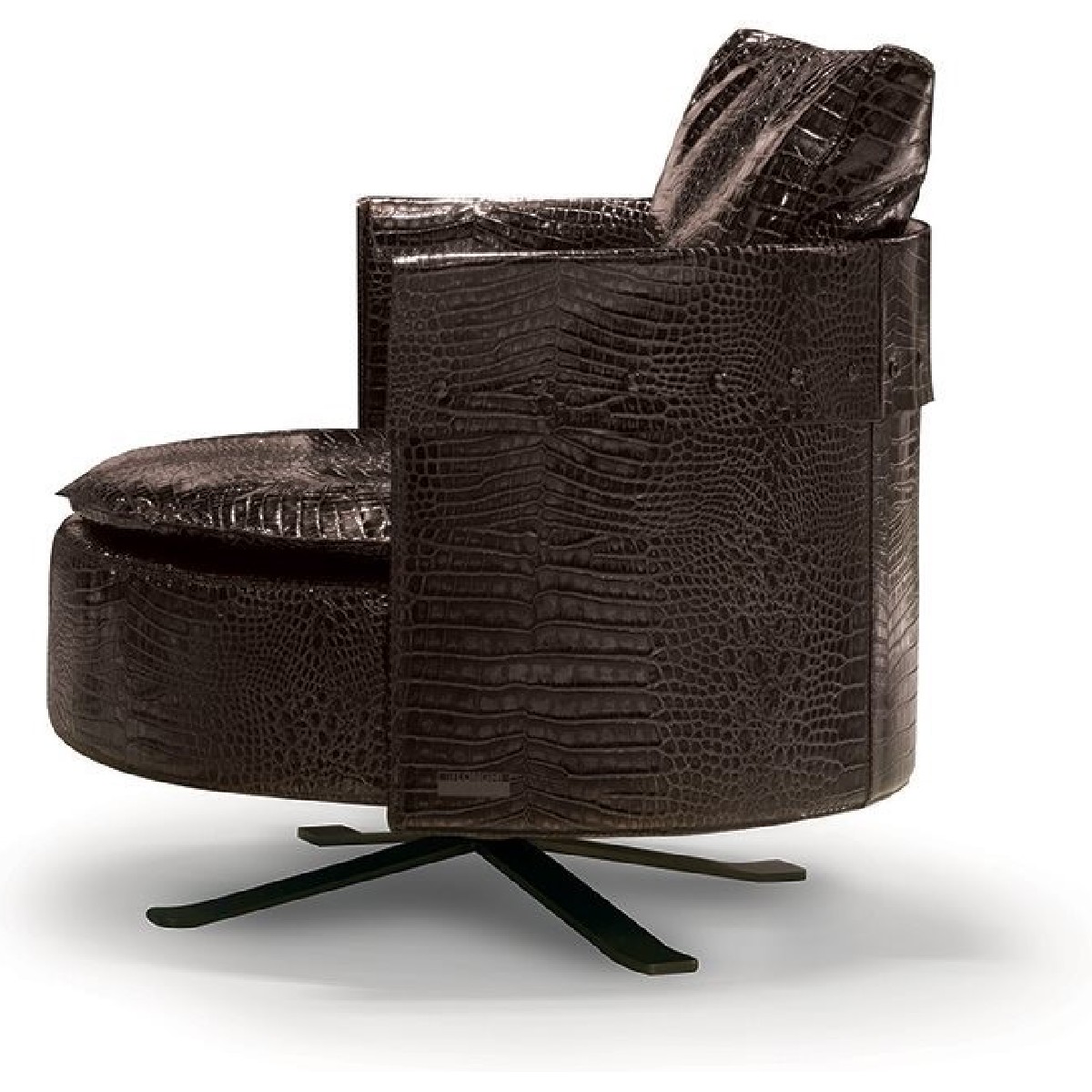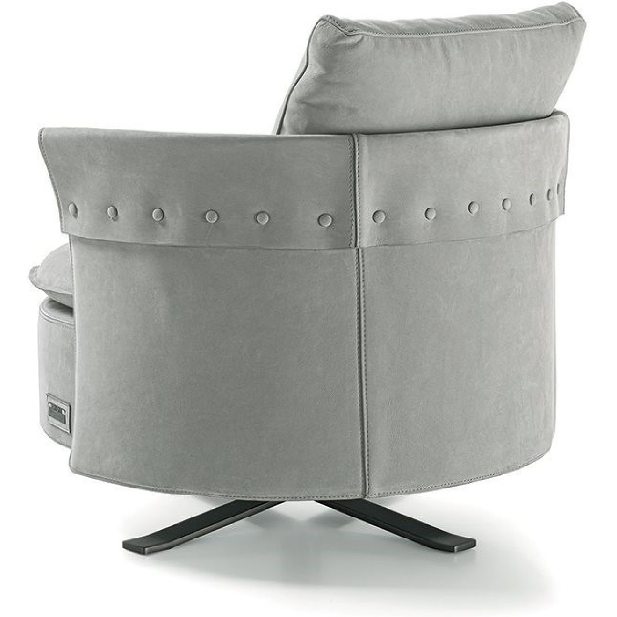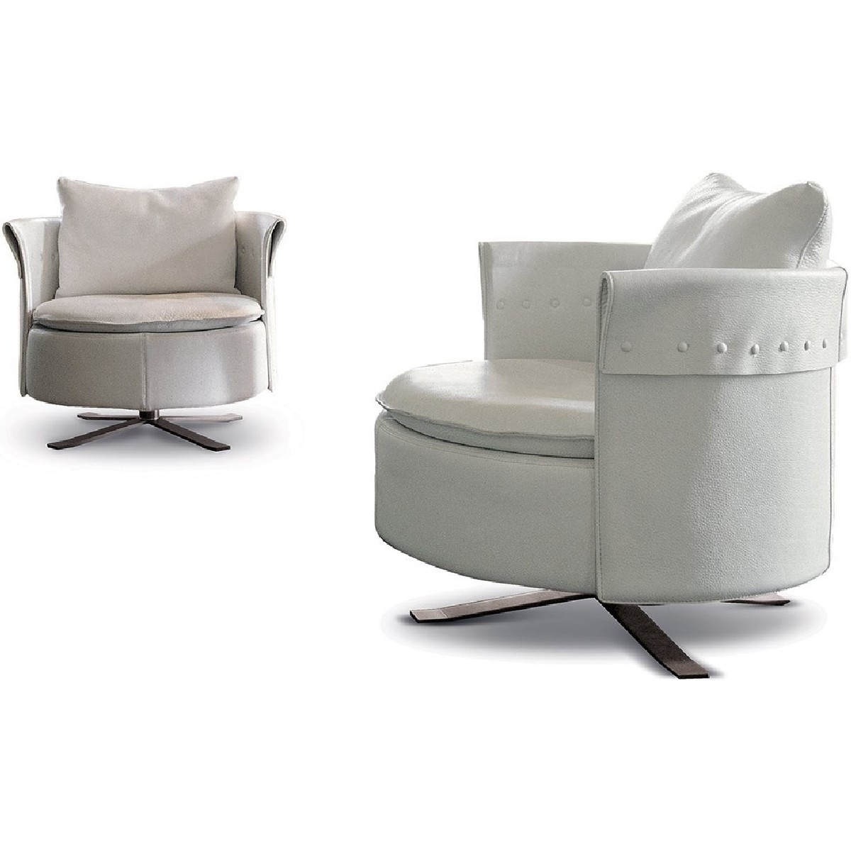 An important armchair on a swivel base, a “must” for the Loveluxe collection, Charme is a rich product with an essential line that entrusts the expressive impact of the project mainly to the precious materials used to make it. The backrest is an elegant, enveloping frame covered in leather that continues into the armrests, slightly widening on the ends and closed with leather-covered buttons to form a small fold like a light origami. The Charme bed and sofa were made following the success of this armchair.