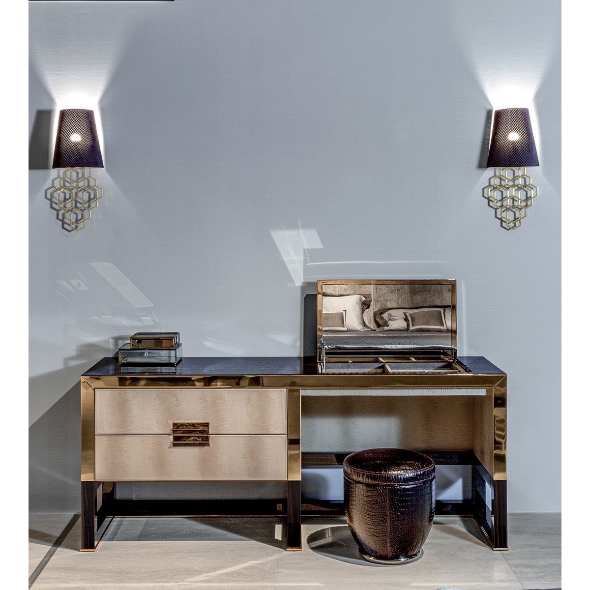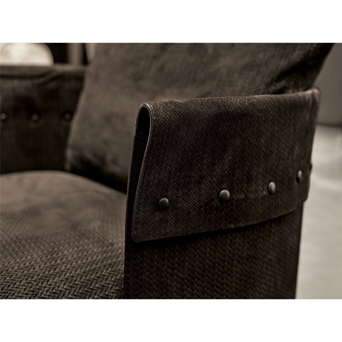 Iron backrest frame assembled on a pine seat with elastic webbing, covered with high-density polyurethane foam in different thicknesses. Seat cushion of medium-density polyurethane foam and Dacron. Anatomically-designed backrest cushions of sterilized goose down for greater comfort. The buttons on the backrest are covered with the same material as the upholstery, or, alternatively, with “Swarovski” crystals. Given the special processing, the leather upholsteries are not removable. Base of ground metal with matt satin bronze finish.