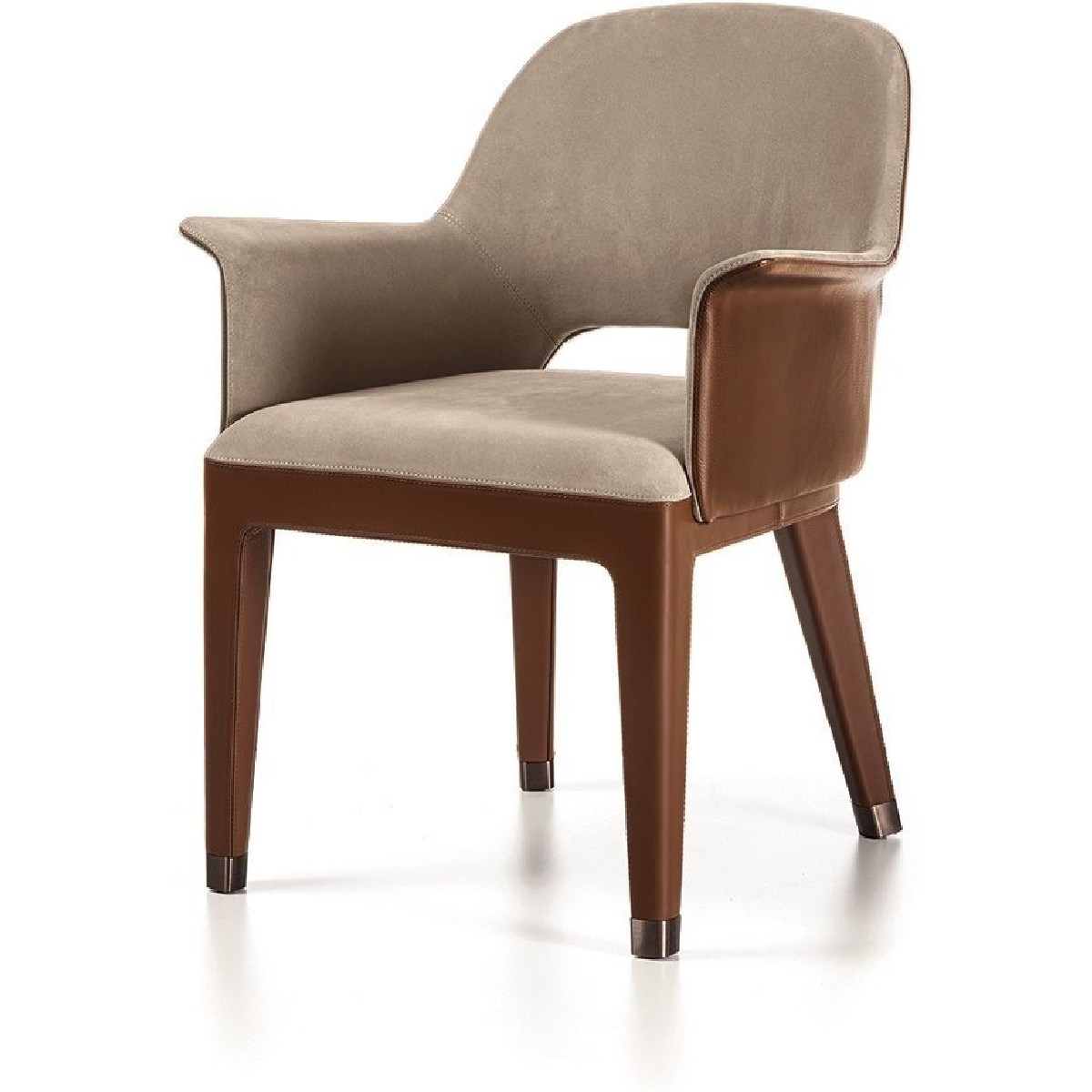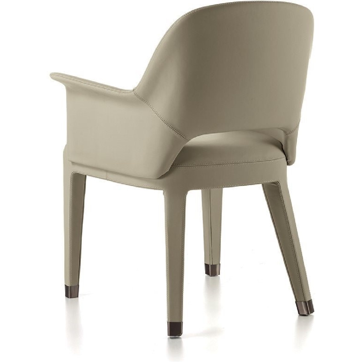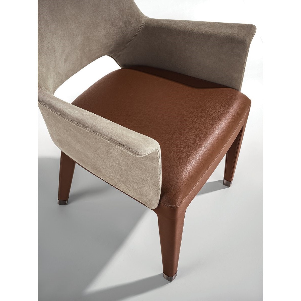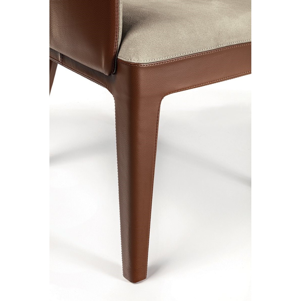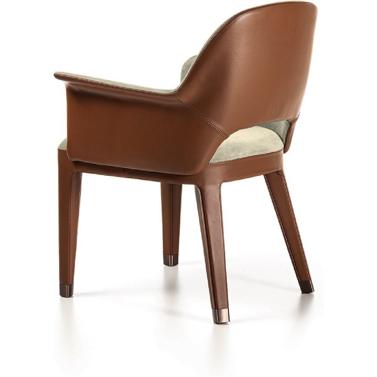 The backrest structure is in iron and cold moulded polyurethane foam. The seat base is in wood with elastic bands covered in multi-thickness polyurethane foam. The upholstery is glued to the frame and therefore non-removable. Four ferrules in bronze coloured PLA can be inserted to protect the leather that covers the bottom of the leg. They are simple to insert and remove if needed, and form the perfect base for the shape of the chair leg.