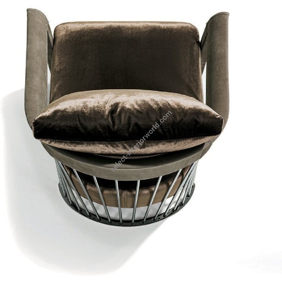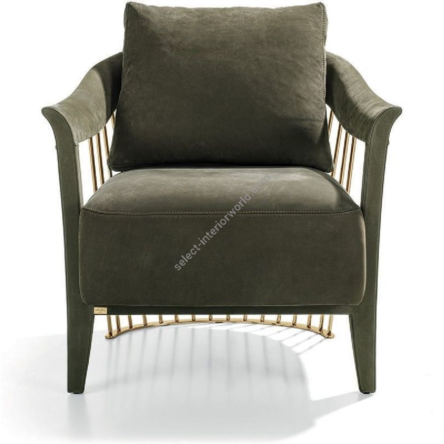 The metal backrest of the armchair is made with a laser-cut frame and by metal pipes assembled individually with a handmade procedure, and chrome plated in the finishes: Satin nickel, bright shaded brown, Black Rose gold, bright light gold, matt Champagne gold, bright chrome, bright black chrome, matt satin bronze, bright pink gold, matt pink gold. The load-bearing structure is cold-moulded in foam with an iron insert, using a designated mould. The upholstery on the structure is available exclusively in hot-glued leather, applied by hand. The seat is in wood and polyurethane foam with three layers of density, with non-removable leather or fabric upholstery. The backrest cushion is in sterilised goose down, covered in removable leather or fabric.