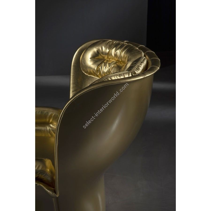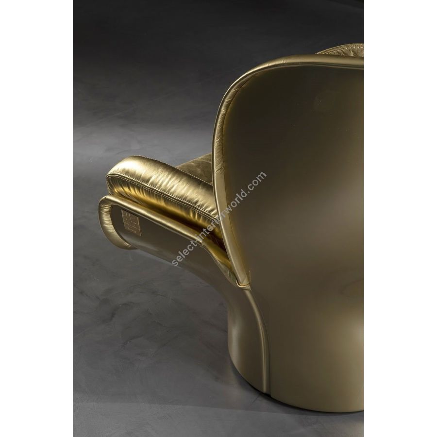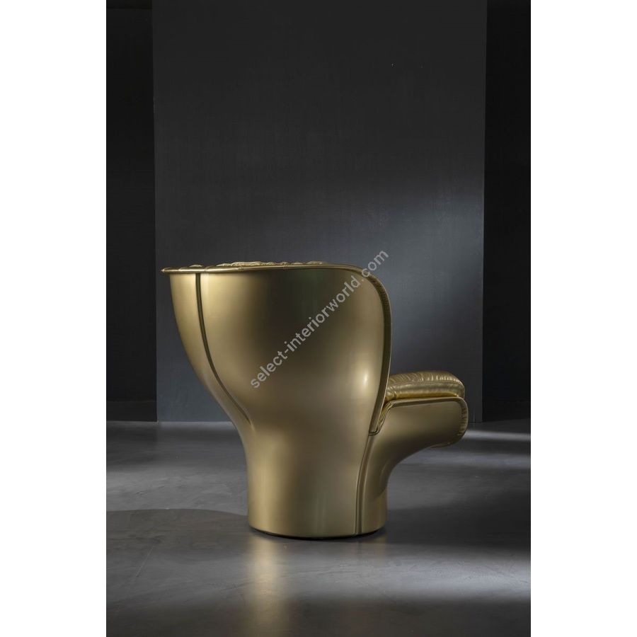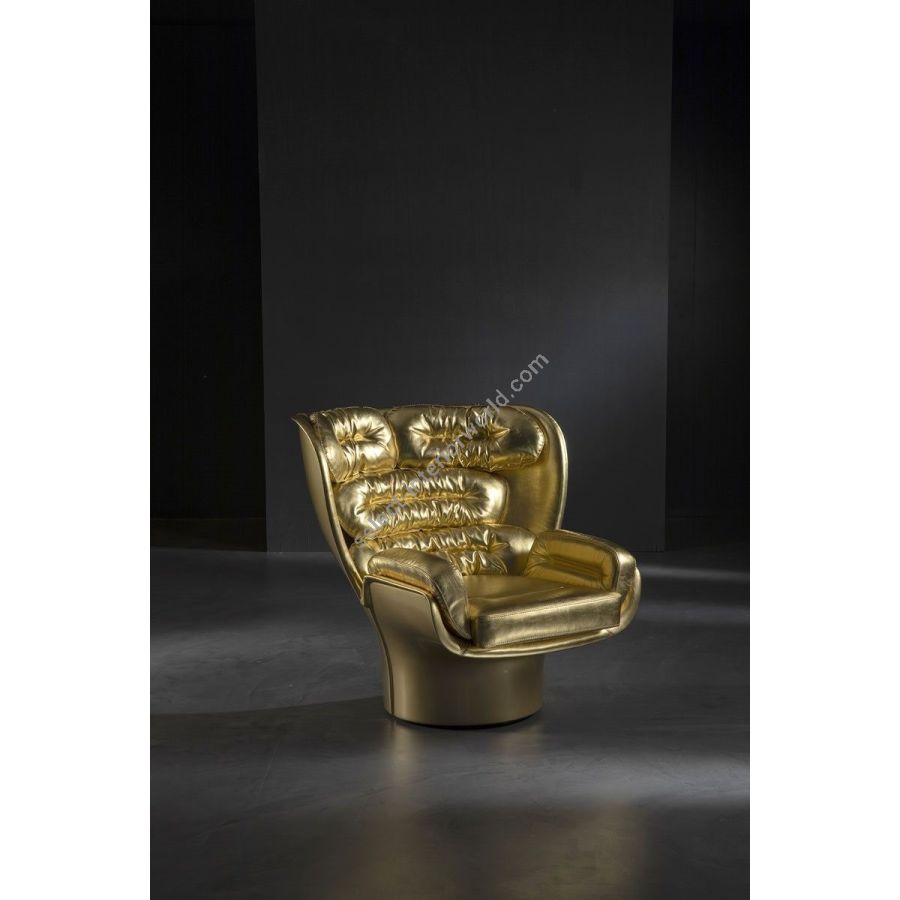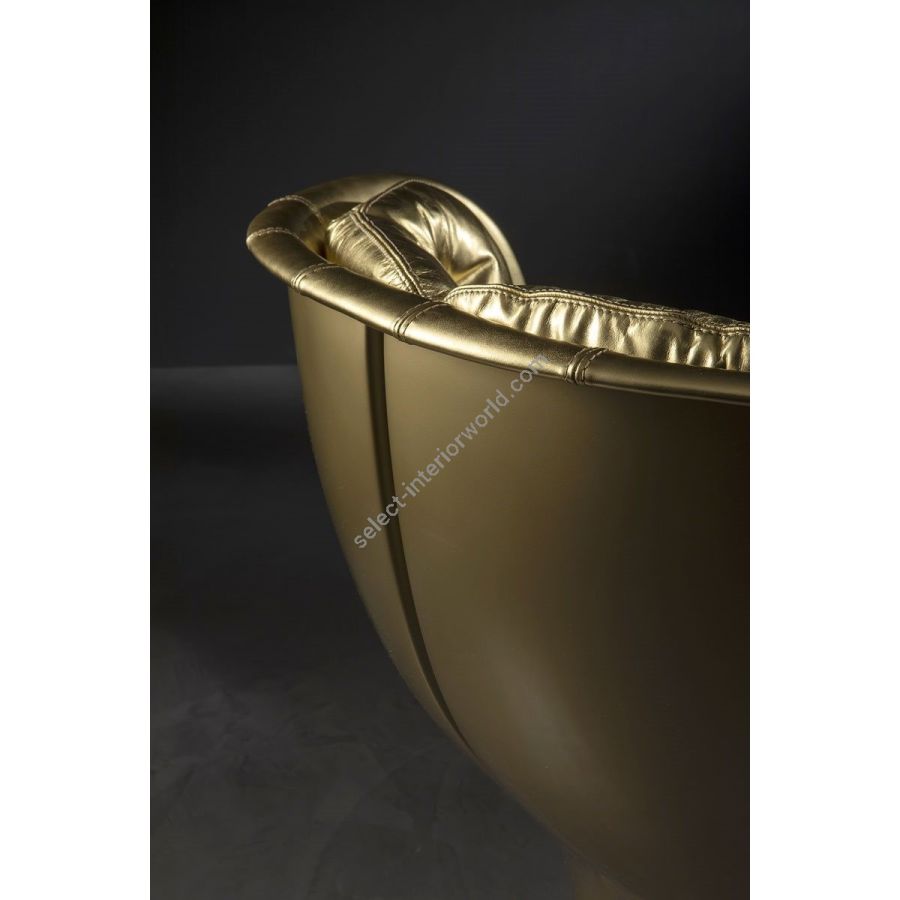 360-degree revolving structure in fiberglass built according to the original design, in moulds, entirely handmade. Anatomically-designed padding of polyurethane foam in different thicknesses, with Dacron cover. Given the special processing, the special bath gold leather upholsteries are not removable. Gold lacquered outer fiberglass frame.