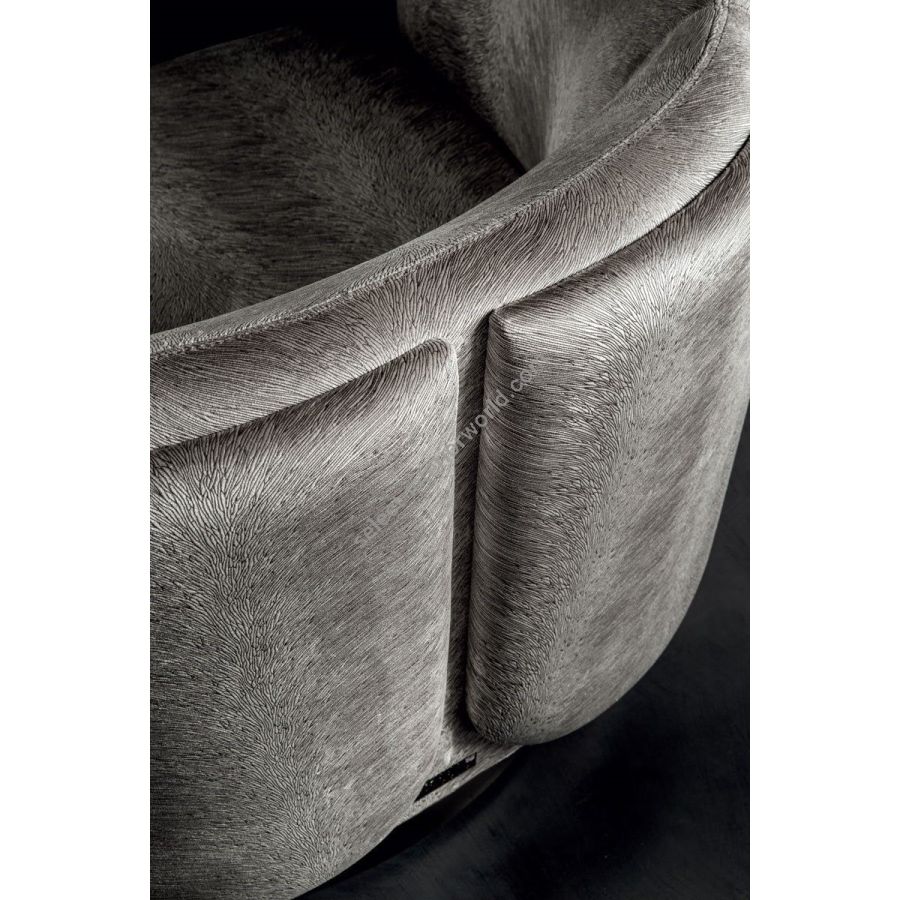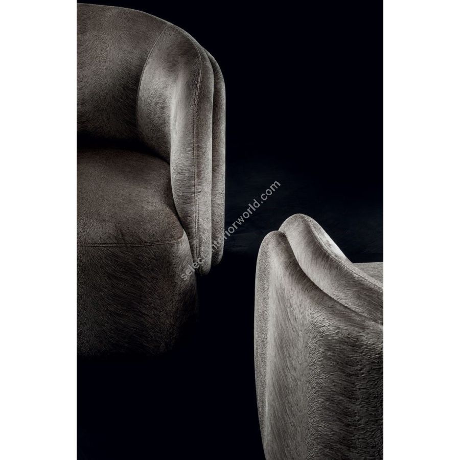 Small armchair with wood structure and elastic bands, covered in high density polyurethane foam. The seat is in triple density polyurethane foam with a cover in polyester bonded with white fabric. The base has a chrome metal ring in the following finishes: Shaded copper, Bright shaded brown, Black Rose gold, bright light gold, Champagne gold, bright chrome, bright black chrome, matt satined bronze. Another important characteristic are the two padded rear wings that seem to embrace the structure. These parts can have a quilted cover with the exclusive “Groove” decoration. Given the particular assembly, the upholstery is not removable.