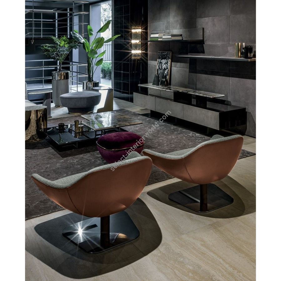 The shape of the chair evokes a vintage look that is updated through the use of highly sophisticated fabric or leather upholstery to create an extremely elegant play of materials. Meredith is the result of a great deal of research focused on how to best express the sophisticated simplicity of the upholstery. The base can swivel 360° with a self-aligning mechanism.