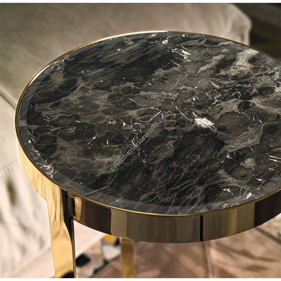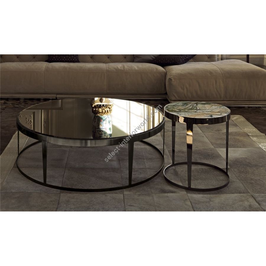 Small table in laser cut ground metal. Frame finish: Satin nickel, bright shaded brown, Black Rose gold, bright light gold, matt Champagne gold, bright chrome, bright black chrome, matt satin bronze, bright pink gold, matt pink gold. Top finish: painted black crystal 8 mm with bevelling, bronze or smoky mirror 6 mm with bevelling, White Carrara marble, Imperial Brown marble, Sahara Noir marble (glossy and matt polyester finish), Dover White marble, Panda White marble, Guatemala Green marble, Corteccia marble, Port Saint Laurent marble, RedLevanto marble, Bardiglio Nuvolato marble, Elegant Brown marble, Shale Rosewood marble, Emperador Dark marble, Silver Wave marble, Agatha Black marble, Frappuccino marble, Calacatta marble, Fusion Light marble, Patagonia marble, Explosion Blue marble, Fusion Multicolor marble, Juliet Quartz marble, Calcite Azul marble, Red onyx, Ivory onyx, glossy lacquered wood in range colours, glossy/matt Maple, glossy/mattheat-treated Eucalyptus, glossy/matt Sycamore frisè, glossy/matt Ebony, glossy/matt Canaletto walnut.