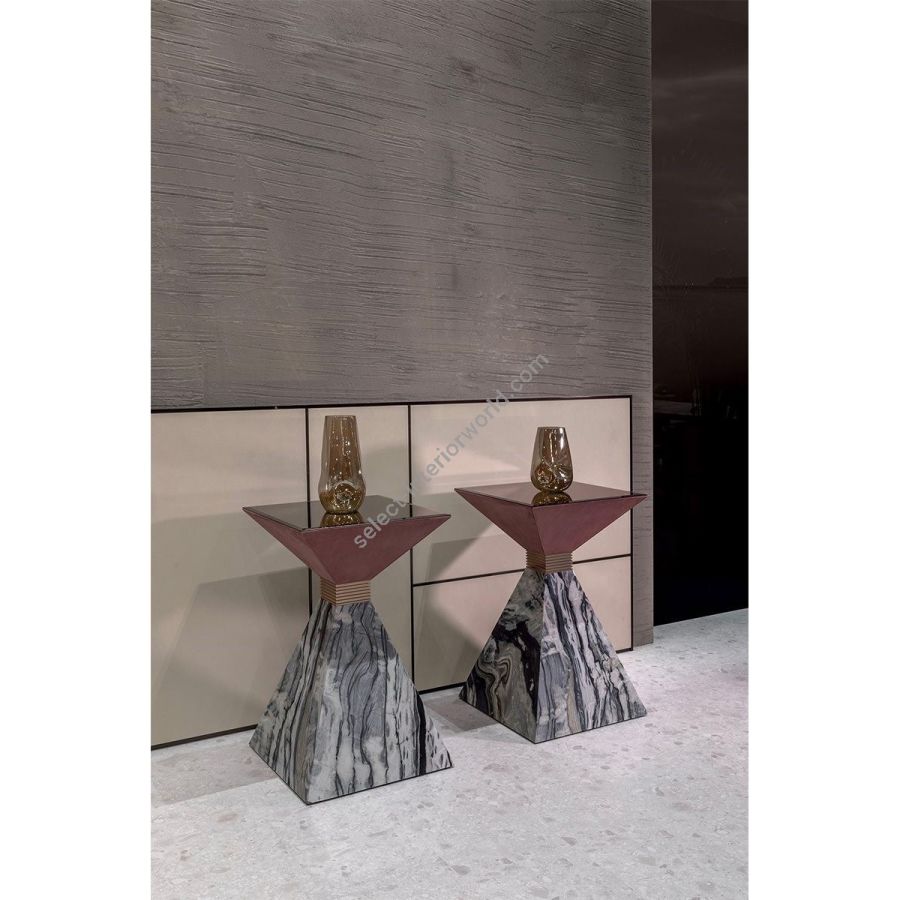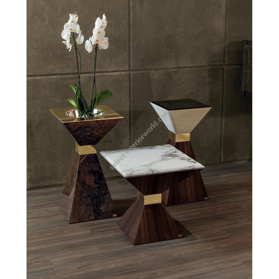 Series of small modular tables with pyramid shaped base available in different sizes and finishes. Wood structure: glossy lacquered wood in range colours, glossy/matt Maple, glossy/matt heat-treatedEucalyptus, glossy/matt Sycamore frisè, glossy/matt Ebony, glossy/matt Canaletto walnut. glossy walnut burl wood, upholstered in range leathers. Turned metal spacer: Satin nickel, bright shaded brown, BlackRose gold, bright light gold, matt Champagne gold, bright chrome, bright black chrome, matt satin bronze, bright pink gold, matt pink gold. Only the top part has an element in lighted honey onyx, or an element in metal, with stainless steel liner to use as a bottle holder or plant box. Top finishes: 4 mm bronze or smoky mirror with bevel 20mm, Marble with 20mm bevel: White Carrara marble, Imperial Brown marble, SaharaNoir marble (glossy and matt polyester finish), Dover White marble, Panda White marble, Guatemala Green marble, Corteccia marble, Port Saint Laurent marble, Red Levanto marble, Bardiglio Nuvolato marble, ElegantBrown marble, Shale Rosewood marble, Emperador Dark marble, Silver Wave marble, Agatha Black marble, Frappuccino marble, Calacatta marble, Fusion Light marble, Patagonia marble, Explosion Blue marble, Fusion Multicolor marble, Juliet Quartz marble, Calcite Azul marble, Azul Macauba marble, Portoro marble. Only for the container unit, the top is in metal as per sample finishes.