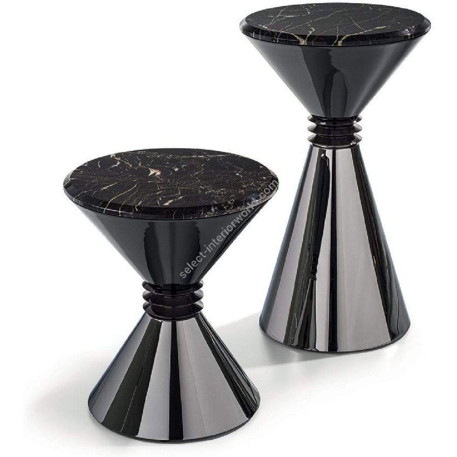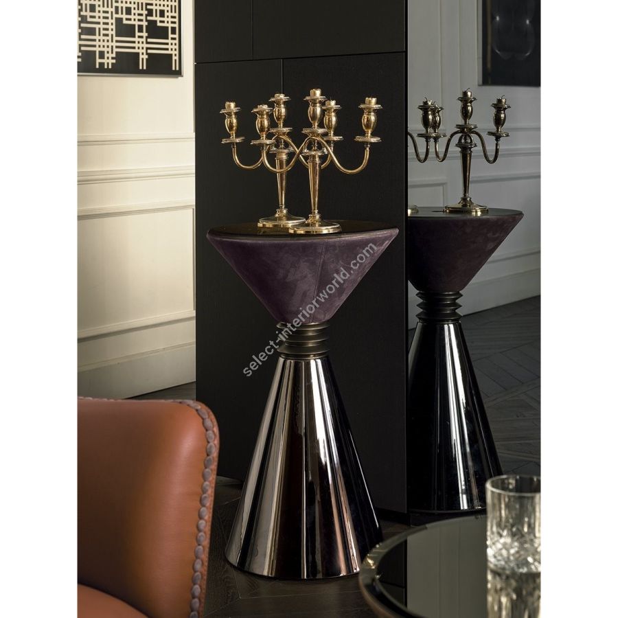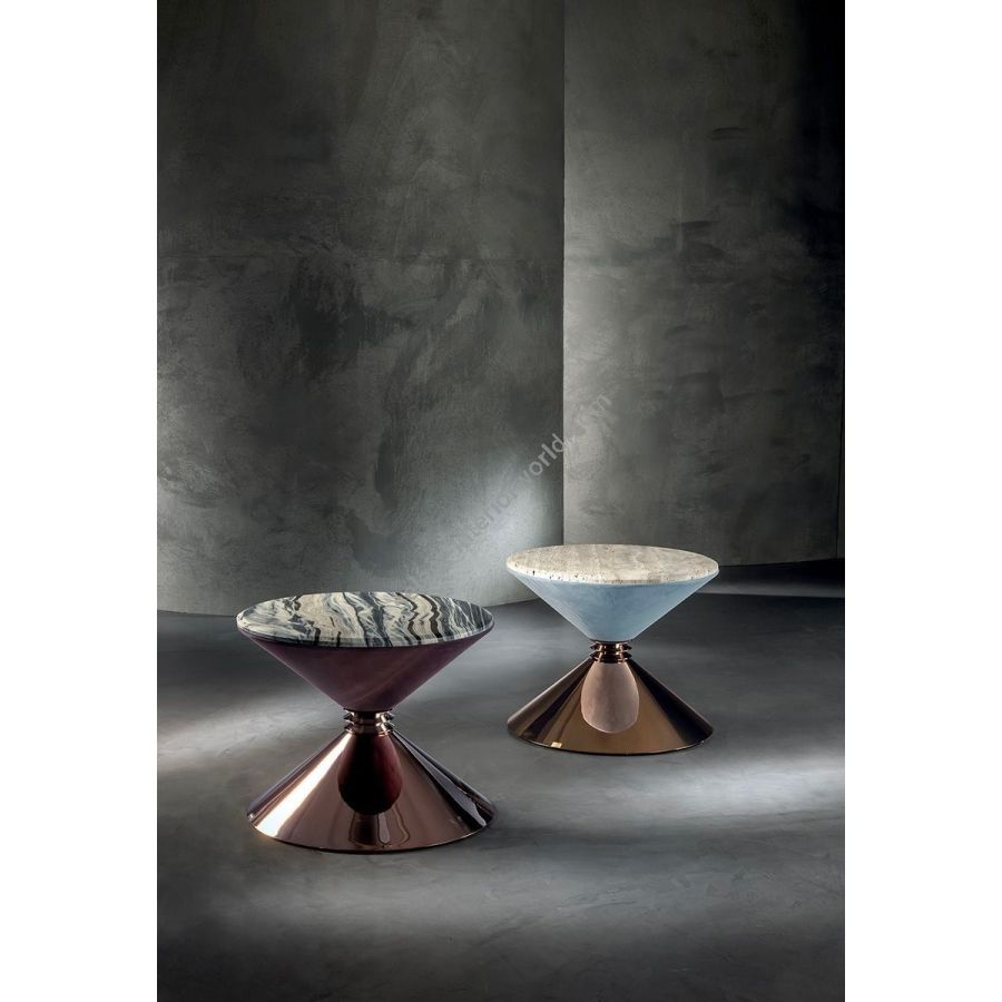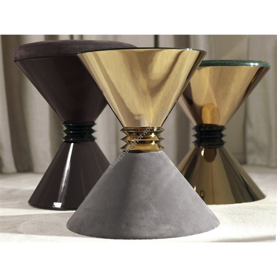 Series of small modular tables with pyramid shaped base available in different sizes and finishes. Structure in metal: Satin nickel, bright shaded brown, Black Rose gold, bright light gold, matt Champagne gold, bright chrome, bright black chrome, matt satin bronze, bright pink gold, matt pink gold, glossy lacquered in range colours, upholstered in range leathers. Turned metal spacers in Black Rose gold, bright light gold, matt Champagne gold, bright chrome, bright black chrome, matt satin bronze, bright pink gold, matt pink gold. Only the top part has a metal element, with stainless steel liner to use as a bottle holder orplant box. Top finish: 4 mm bronze or smoky mirror with bevel, Marble th 20 mm with 20mm bevel: WhiteCarrara marble, Imperial Brown marble, Sahara Noir marble (glossy and matt polyester finish), Dover Whitemarble, Panda White marble, Guatemala Green marble, Corteccia marble, Port Saint Laurent marble, Red Levanto marble, Bardiglio Nuvolato marble, Elegant Brown marble, Shale Rosewood marble, Emperador Dark marble, Silver Wave marble, Agatha Black marble, Frappuccino marble, Calacatta marble, Fusion Light marble, Patagonia marble, Explosion Blue marble, Fusion Multicolor marble, Juliet Quartz marble, Calcite Azul marble, Azul Macauba marble, Portoro marble.Only for the container unit, the top is in metal as per sample finishes. ANGIE pouf: the small table becomes a stool/pouf by applying a cushion covered in leather from the range.