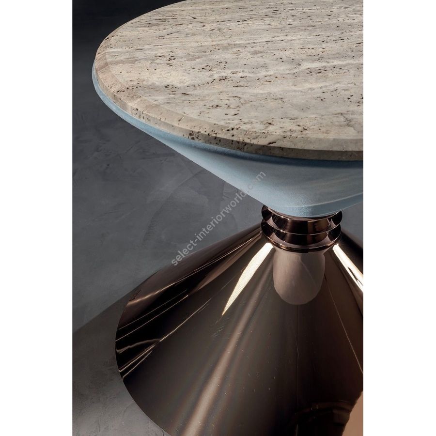 Series of modular small tables with conical metal bases, perfect for any occasion. Many sizes available and an infinite choice of finishes: choose the height of the cone base, the metal spacer, the upper module and the top to create a unique table. Add a circular cushion to transform the table into a comfortable pouf.