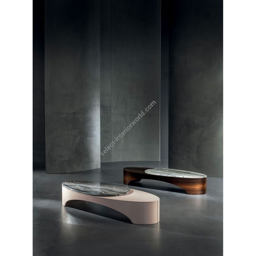 Small oval table with a wooden bridge structure in the finishes: Matt eucalyptus, Matt ebony, Matt sycamore frisè. Or glossy lacquer in the colours in the catalogue. The marble is set on the top in an asymmetrical and off-centred position, with a 20 mm thick half bullnose edge: Travertino, Silver Beola, Cipollino marble, Arabescato Orobico marble, Silver Stream marble, White Carrara marble, Imperial Brown marble, ElegantBrown marble, Sahara Noir marble (polyester finish), Dover White marble, Guatemala Green marble, RedLevanto marble, Shale Rosewood marble, Emperador Dark marble, Silver Wave marble, Agatha Black marble, Frappuccino marble, Calacatta marble, Patagonia marble, Juliet Quartz marble. On the two ends of the ellipse, there are two metal inserts, in the finishes: Satined champagne, Bright/satined Burnished,Shaded copper, Bright/satined brown, Bright/satined Black rose, Bright/satined light gold, Bright/satined chrome, Bright/satined black chrome, Matt satined bronze.GREGGDesign by Giuseppe VIGANÒ_Y 928 pg.281807732474070