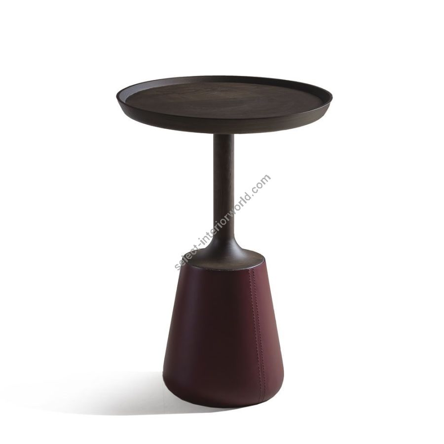 Round utility table in solid turned wood, in a single piece, stained moka or grey. The base is covered in leather in the colours: burgundy, taupe, tobacco, natural.