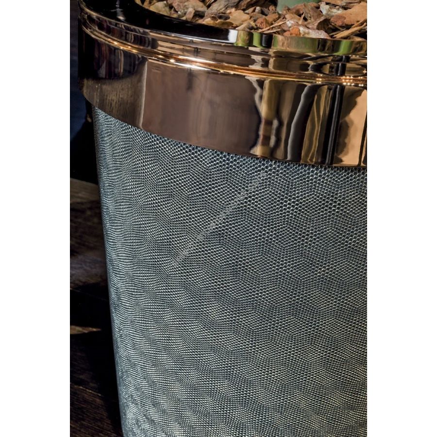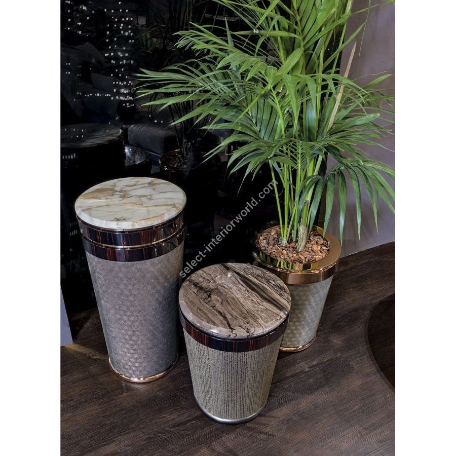 Small table/cachepot with fibreglass structure upholstered in leather or fabric from the catalogue, and ornamental metal rings in the finishes: Satin nickel, bright shaded brown, Black Rose gold, bright light gold, matt Champagne gold, bright chrome, bright black chrome, matt satin bronze, bright pink gold, matt pink gold. Or in wood in the finishes: glossy lacquered wood in range colours, glossy/matt Maple, glossy/mattheat-treated Eucalyptus, glossy/matt ebony, glossy/matt Canaletto walnut, glossy/matt Sycamore frisè. Top finishes: 5 mm bronze or smoky mirror with bevel. 20mm marble with 20mm bevel: Azul Macauba marble, Portoro marble, Sahara Noir marble (polyester finish), Dover White marble, Panda White marble,Guatemala Green marble, Corteccia marble, Port Saint Laurent marble, Red Levanto marble, Bardiglio Nuvolato marble, Elegant Brown marble, Shale Rosewood marble, Emperador Dark marble, Silver Wave marble,Agatha Black marble, Frappuccino marble, Calacatta marble, Fusion Light marble, Patagonia marble,Explosion Blu marble, Fusion Multicolor marble, Juliet quartz marble, Calcite Azul marble. Possibility of inserting a container element for plants or flowers with circular top in metal, in the finishes from the catalogue.