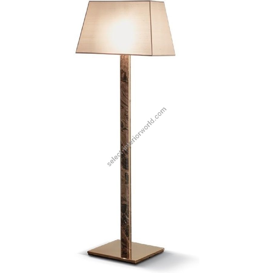 Floor and tabletop lamp with touch-sensitive activation. Frame in metal with finishes: Black Rose gold, bright shaded brown, bright light gold, bright chrome, bright black chrome, matt satined bronze. Column in bevelled marble: Calacatta marble, Frappuccino marble, Agatha Black marble, Emperador dark marble. Or covered in leather from our catalogue. Lampshade lined in the satin fabric in the colours white, black, beige or red, or in natural linen. Standard electrification: 230V, 50Hz - E27.