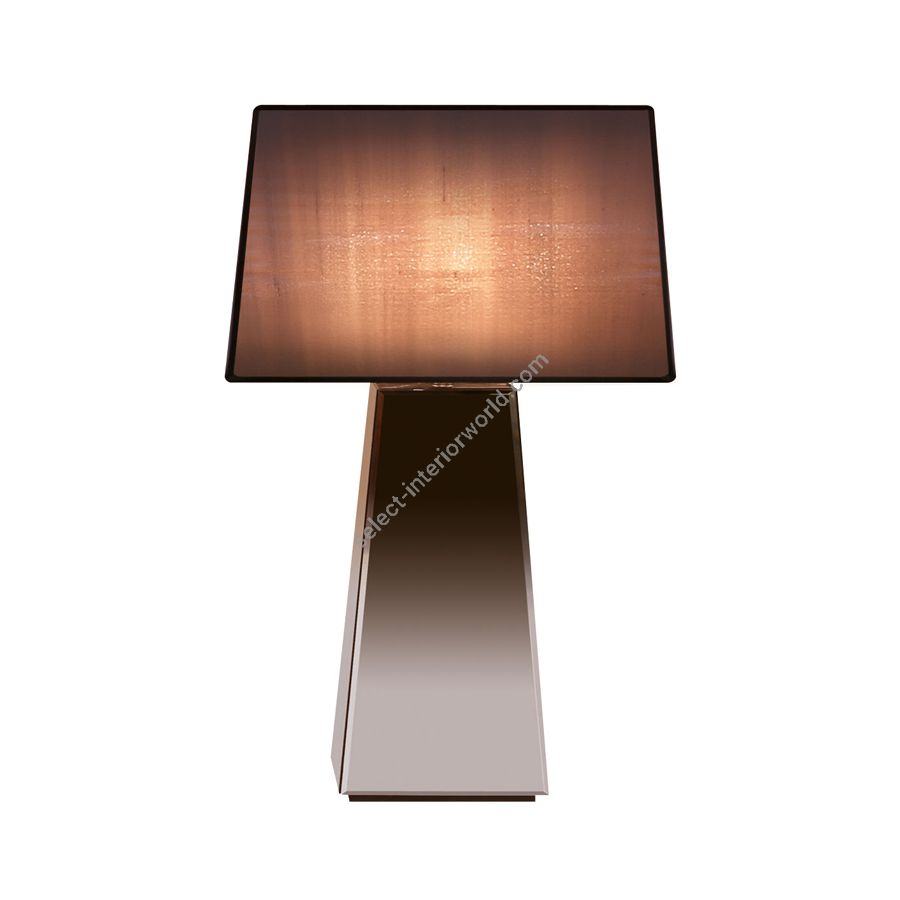 Table lamp with structure covered in smoked bevelled mirror. Base in wood.