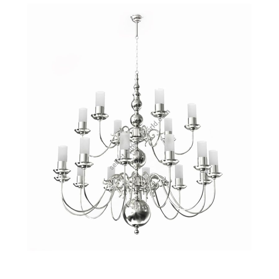 This particular model comes with 18 light points, a polished nickel finish brass structure and glass diffusers. Available in various finishes.