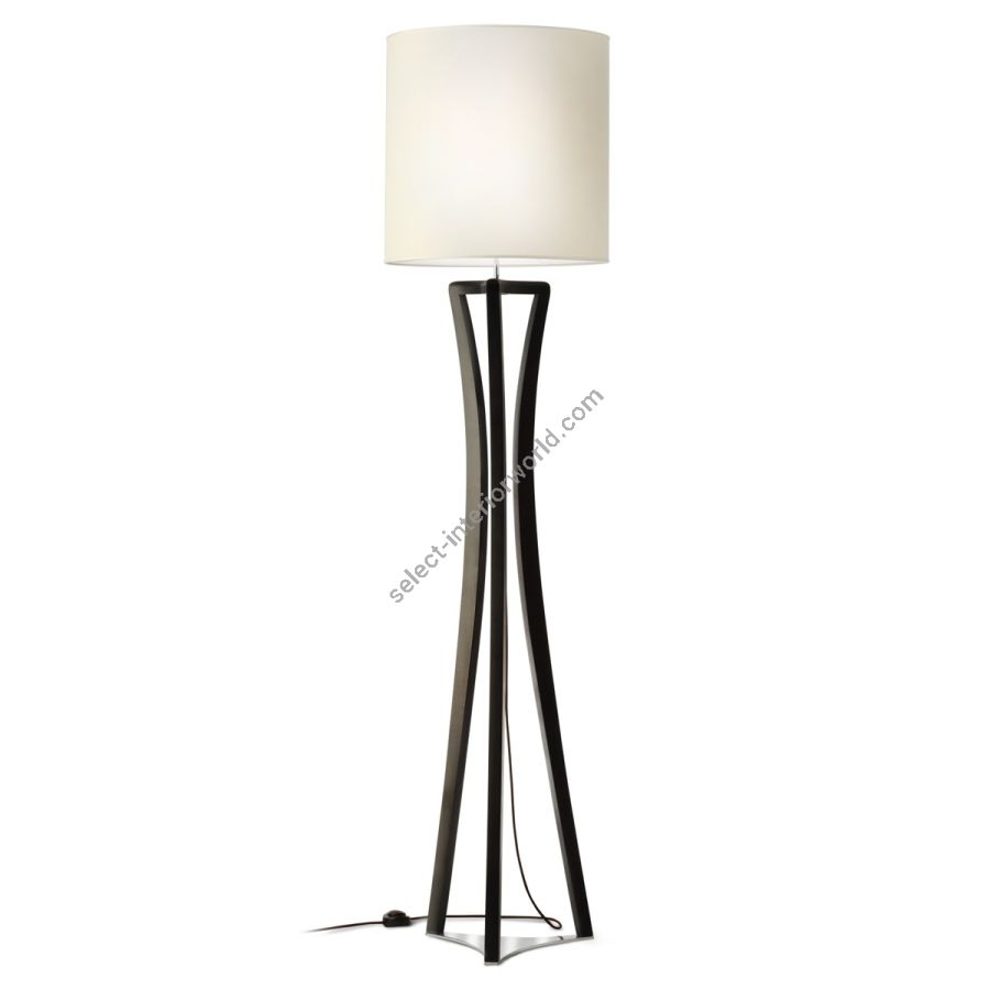This bright floor lamp, with a wenge-colored decorated wooden structure and chromed metal base, completed with a cylindrical lampshade in ivory fabric, is perfect for lighting a bedroom, a dining room or a living room. Available in various colors.