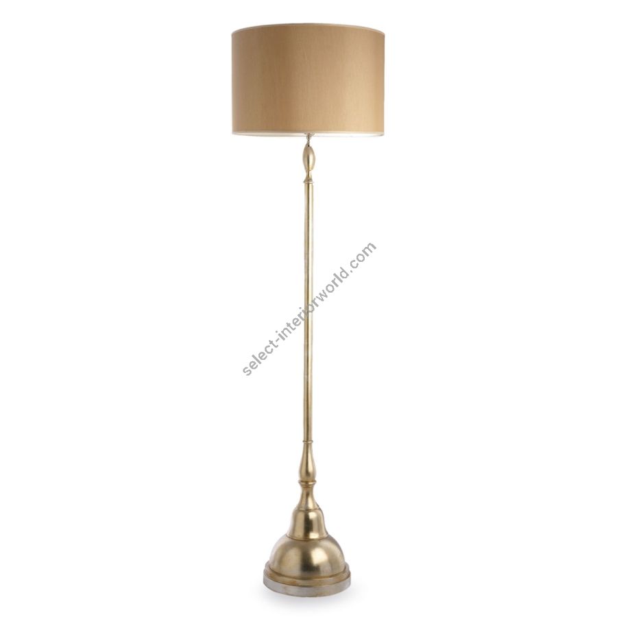 Elegant floor lamp in classic style for rooms and common areas, composed of a linear stem and a round base in wood decorated with silver leaf.