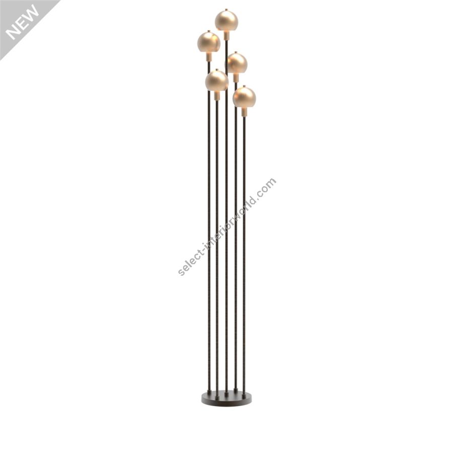 Characterized by five linear stems in bronze-finish brass, complemented by five spherical lampshades in brushed gold-finish brass, the floor lamp can be used in both night and day areas. Available in various finishes.
