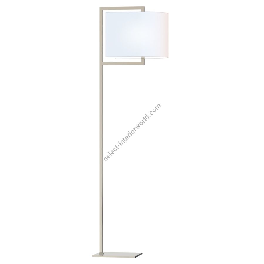 Floor lamp of contemporary and refined design for bedrooms, corridors and common areas, with structure composed of a rectangular frame and fixing base in brass with polished nickel finish. Shaped lampshade in white fabric. Available in various colors.