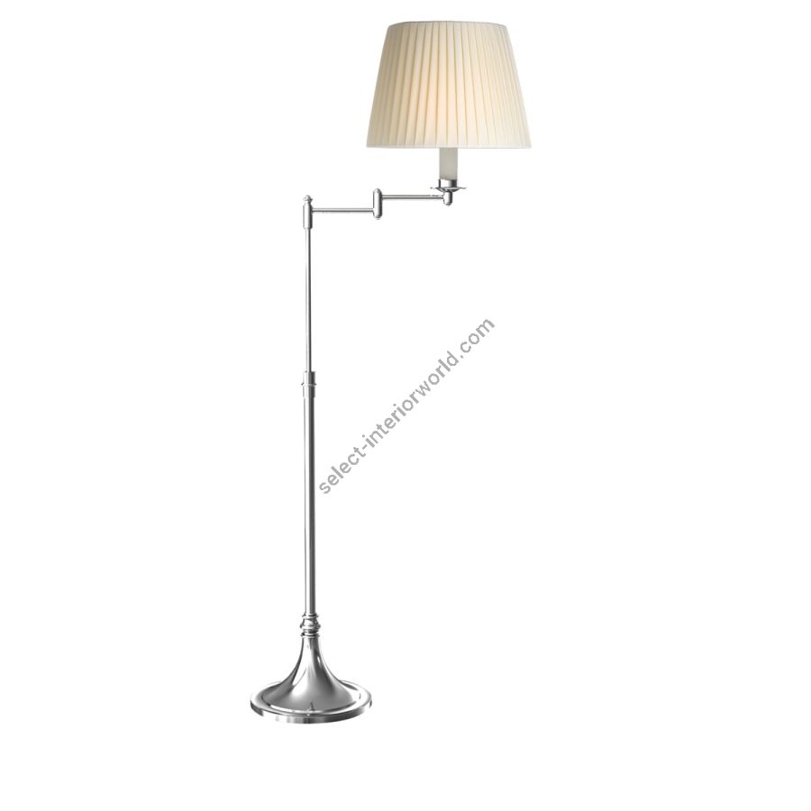 Consisting of a round base from which rises a linear structure with an articulated arm, all made of metal in a chrome finish and completed by a lampshade in ivory pleated fabric.