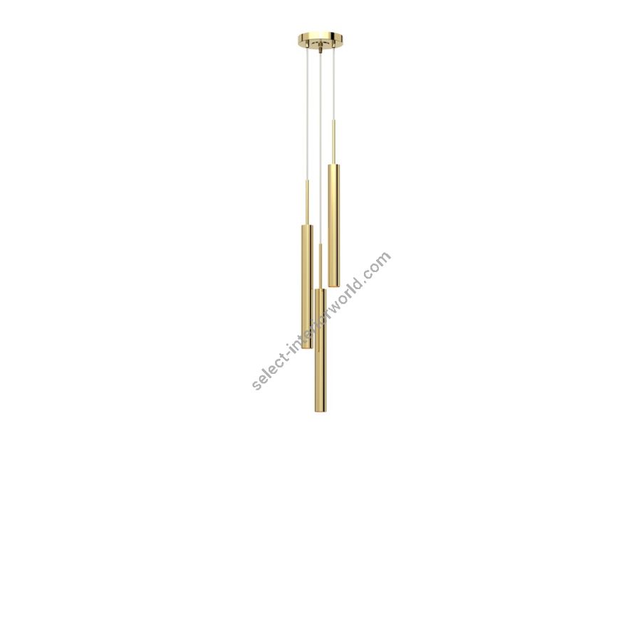 Inspired by a contemporary and sophisticated design, this suspension lamp ideal for bedrooms and living areas is a clear example of aesthetic and practical functionality. Composed of a structure with a round ceiling base and three cylindrical brass pendants, made in the precious light gold finish.