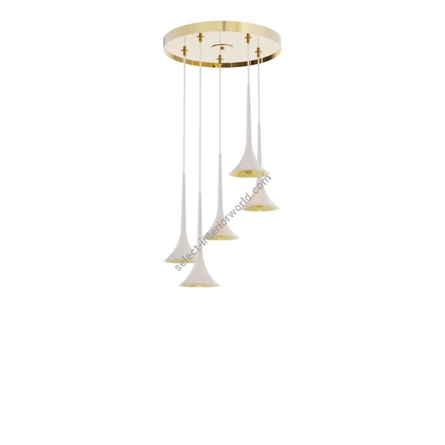 This contemporary style suspension model for bedrooms and common areas, is composed of 5 metal elements of different lengths and a light gold finish metal ceiling fixing base, with transparent electrical cables.