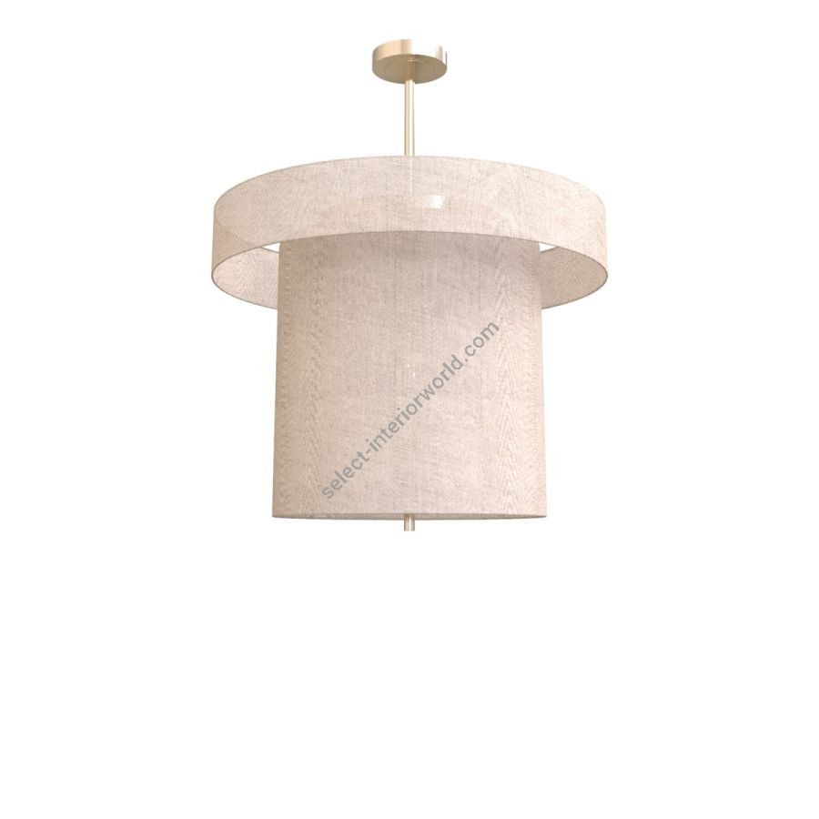 Strong of a great balanced aesthetic sense, this suspension lamp is composed of two cylindrical lampshades in ivory fabric, complete with lower glass diffuser and metal details with light gold finish.