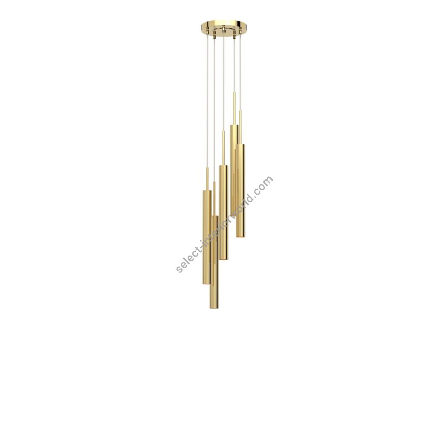 Inspired by a contemporary and sophisticated design, this suspension lamp ideal for bedrooms and living areas is a clear example of aesthetic and practical functionality. Composed of a structure with a round ceiling base and five cylindrical brass pendants, made in the precious light gold finish.