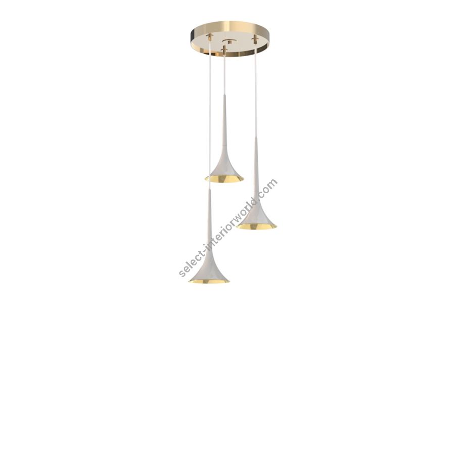 This contemporary style ceiling suspension is composed of three light points emerging respectively from three metal elements of different lengths and a light gold finish metal base for fixing to the ceiling. With transparent electrical cables. Designed for bedrooms and common areas.