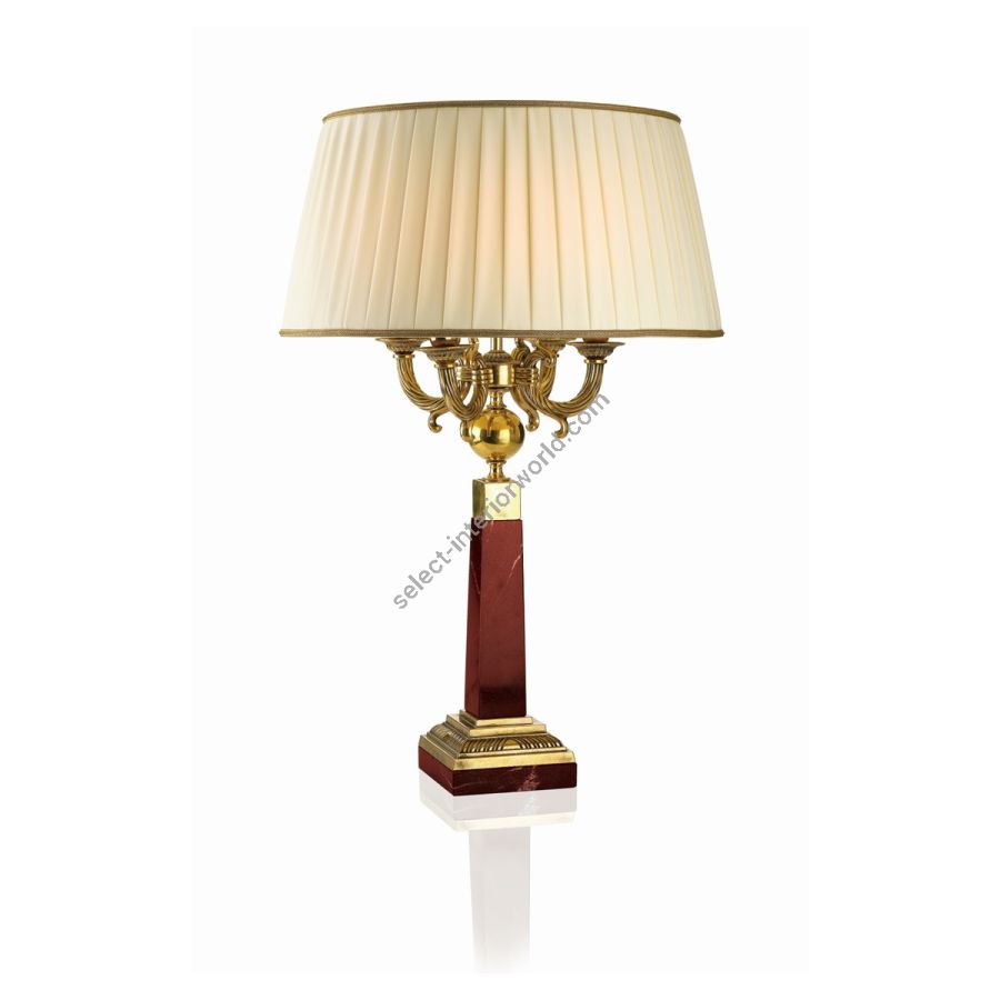 Characterized by a structure in antiqued brass and red marble, enriched with details in cast brass. This luminous body is completed by four light points on arms with unique details and a conical lampshade in ivory pleated fabric.