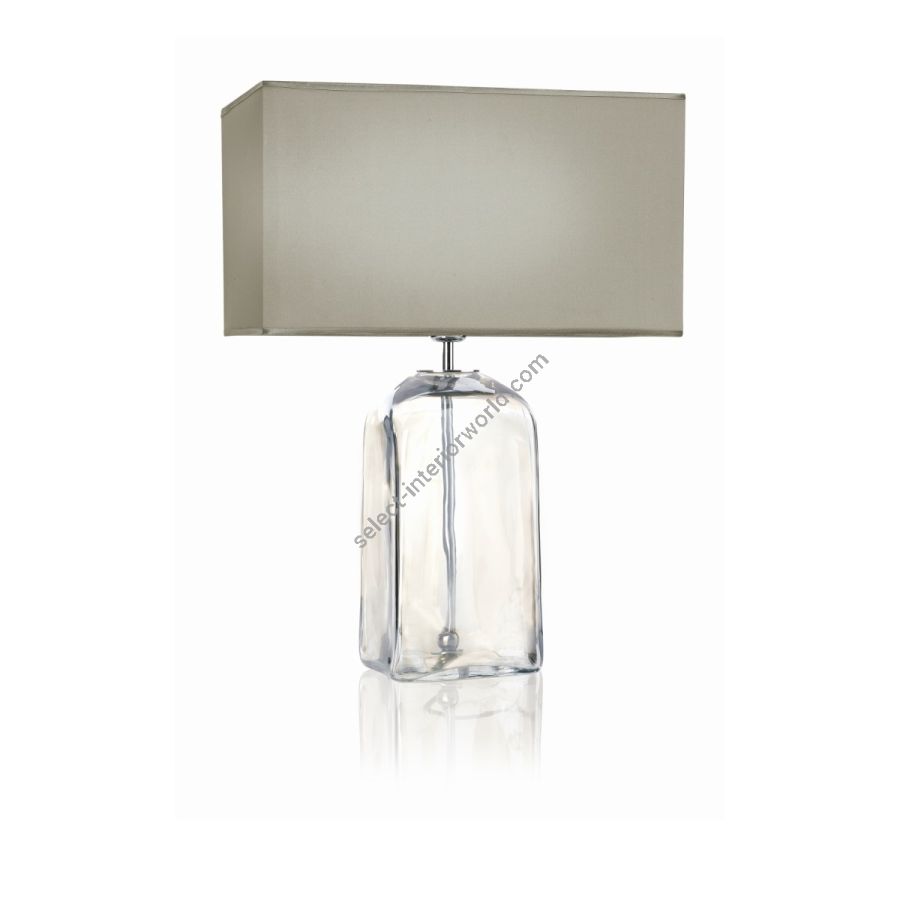 This lighting item is made with a central body in transparent glass, which shows the metal details in a chrome finish inside. To complete a rectangular lampshade in ivory fabric.