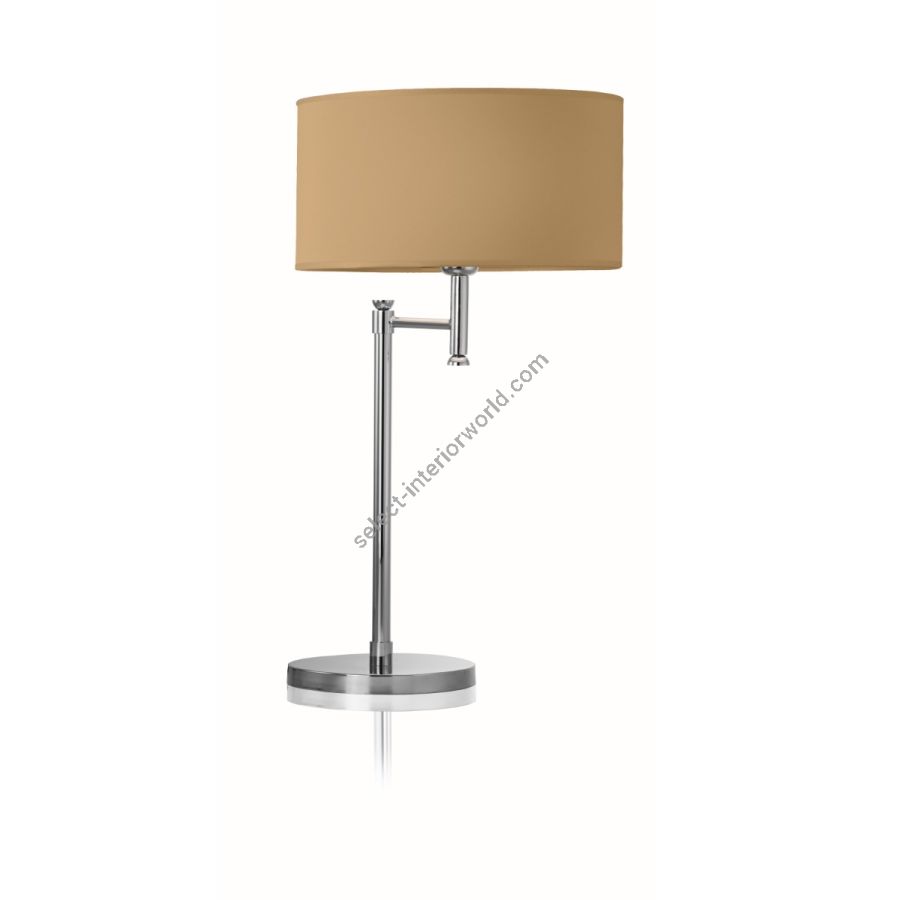 With its versatile character, this chrome-finish brass table lamp is made up of a cylindrical lampshade in sand-colored fabric. Available in chrome, nickel and light gold finishes.