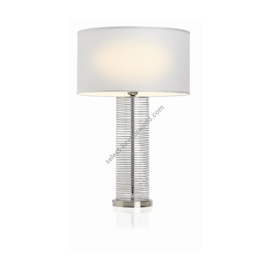 Contemporary table lamp, bedside table or desk with a cylindrical design, with decorated glass structure and details in polished nickel finish.