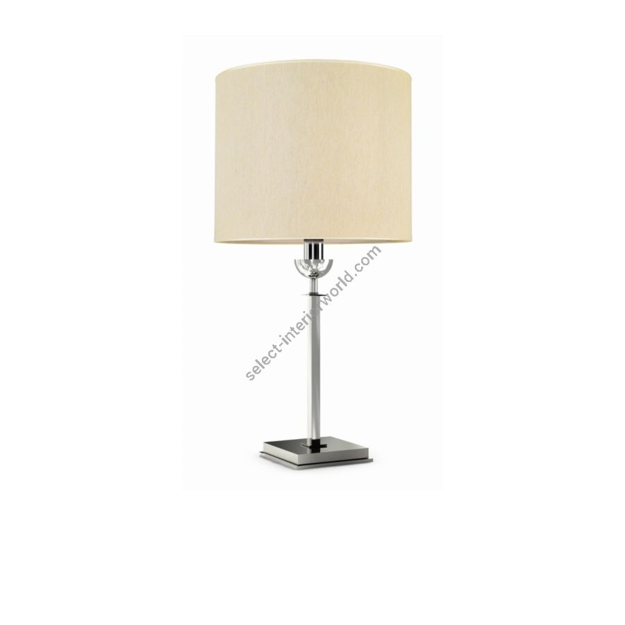 The bedside lamp model has a body with a chrome finish brass structure and a cylindrical lampshade in ivory fabric. Available in various finishes.