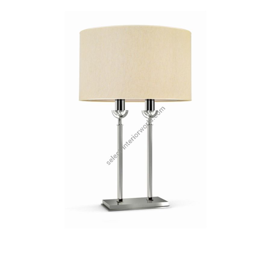 The bedside or table lamp model, with two light points, has a brass structure composed of a rectangular base and two stems in a chrome finish, surmounted by a cylindrical lampshade in ivory fabric. Available in various finishes.
