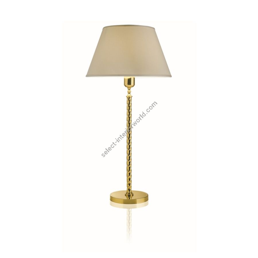 The structure, including a round base and defined by soft and delicate lines, was made of polished brass. The article is completed by a truncated cone-shaped lampshade in sand-colored fabric.