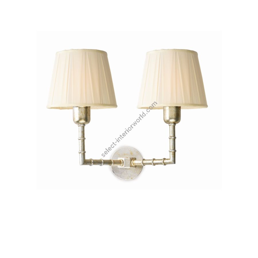 The design is characterized by a round base and a linear stem, which cyclically presents small rings equidistant from each other, all made of brass and decorated in silver leaf. This two-light wall model is completed by two conical lampshades in ivory pleated fabric.