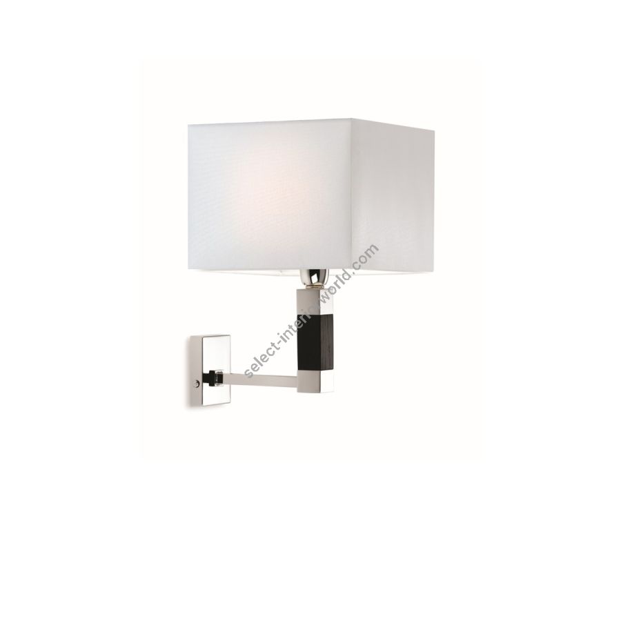 Consisting of a brass structure with a polished nickel finish and enriched with wengé-colored wood details, this wall lamp for bedrooms, corridors and common areas is completed by a square lampshade in white fabric.