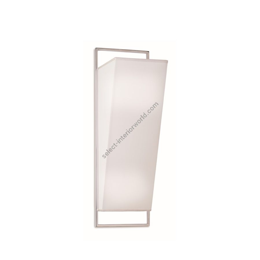 Perfect match for bedrooms and common areas, the wall lamp model has a vertical structure in brass with a polished nickel finish, framing a shaped lampshade in white fabric. Available in various colors.