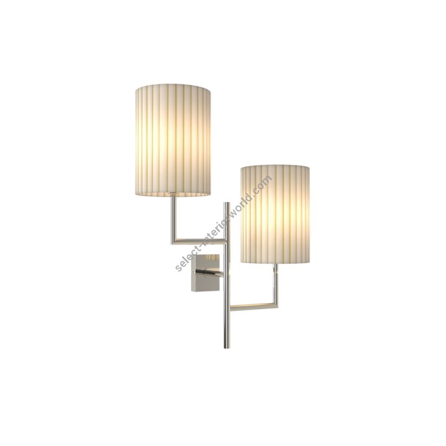 Wall lamp in brass in polished nickel finish, with a contemporary and refined design, for bedside, bedrooms, corridors, composed of a square wall fixing base and a branched structure with two light points, on which there are two cylindrical lampshades in ivory pleated fabric.