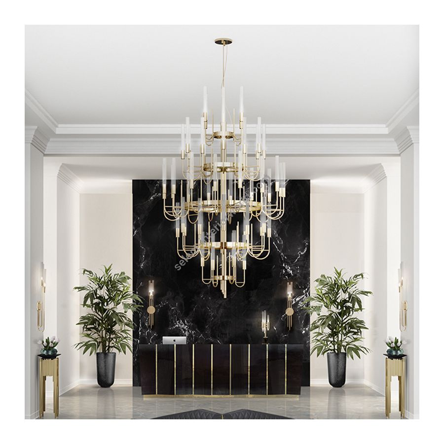 Combining the modern age and luxury, the Gala Chandelier is a revival experience from the palatial apogee. Made with brass and clear crystal glass, this imposing item is perfect for any entrance or ball room.