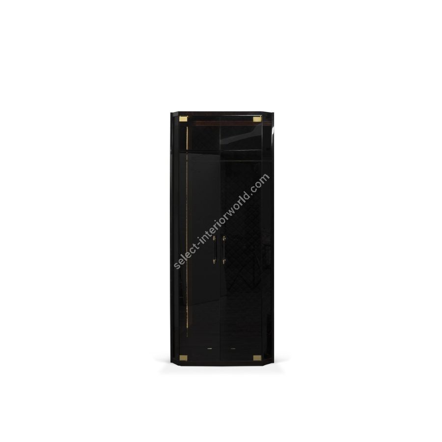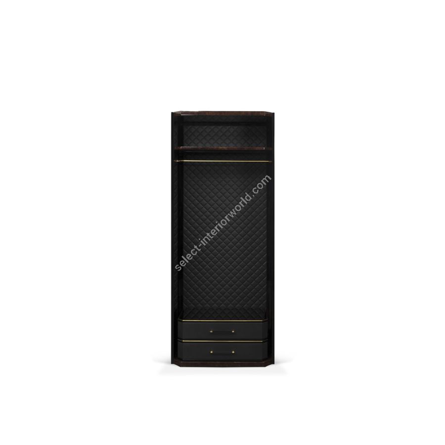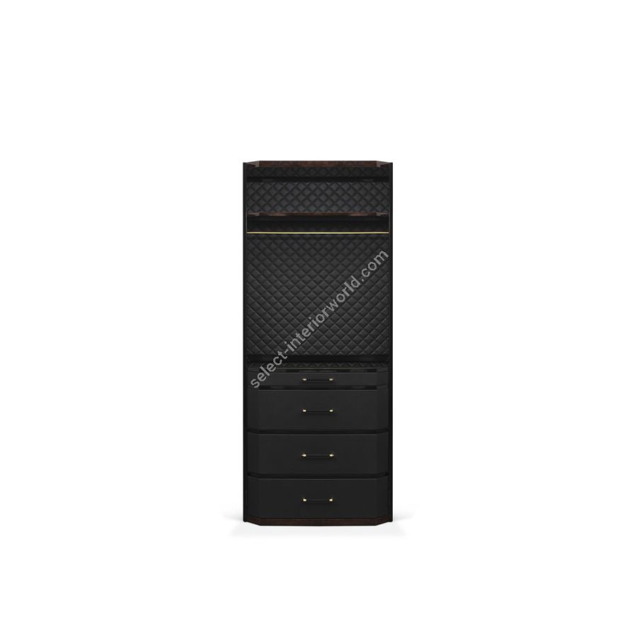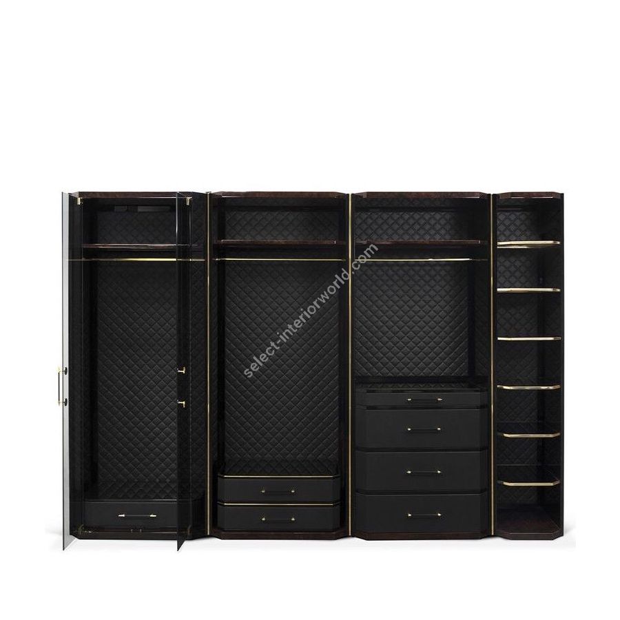 The Waltz Closet is an elegant, modular clothing storage solution made with the finest materials, such as walnut root veneer, black leather, black lacquered wood, brass, and smoked glass. This luxury storage solution is perfect for a modern master bedroom, offering a fully customizable organization system with shelves, rods, and drawers. This modular piece allows for different module combinations, ensuring a perfect fit for your space.