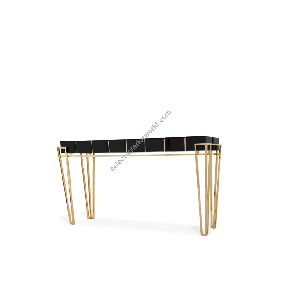 The glorious geometrical construction of the Nubian pyramids has resulted in a captivating and contrasting geometric design. This design showcases the complexity of noble materials, including glass, walnut root veneer, and brass. The Nubian Console is an elaborate embodiment of luxury and refined elegance, making it a promising focal point in any setting.