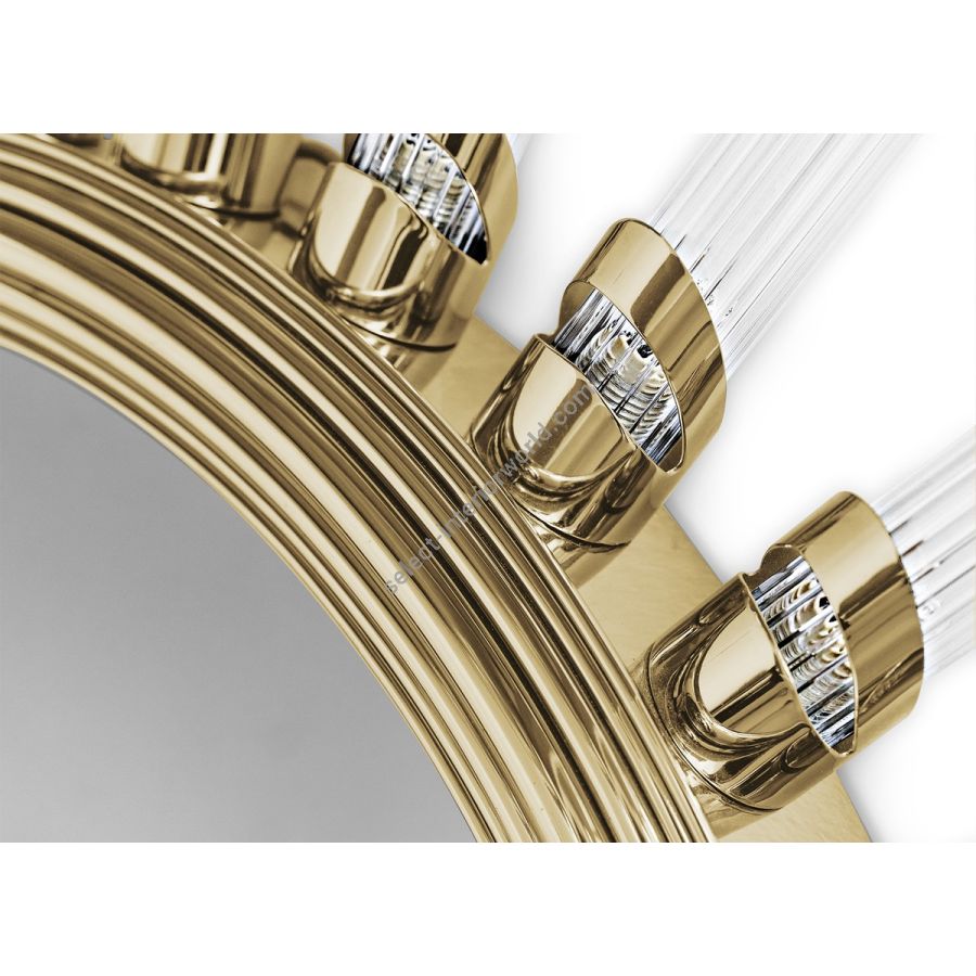 Distinguished by its impressive size, the Majestic XL Wall Light Mirror embodies luxury in every detail, just like its predecessor. The radiant glow emanates from the gold-plated brass circle, beautifully complemented by the ribbed crystal glass cylinders that exude elegance and illumination. This captivating combination of lighting and design will effortlessly enhance any project, residential or commercial.