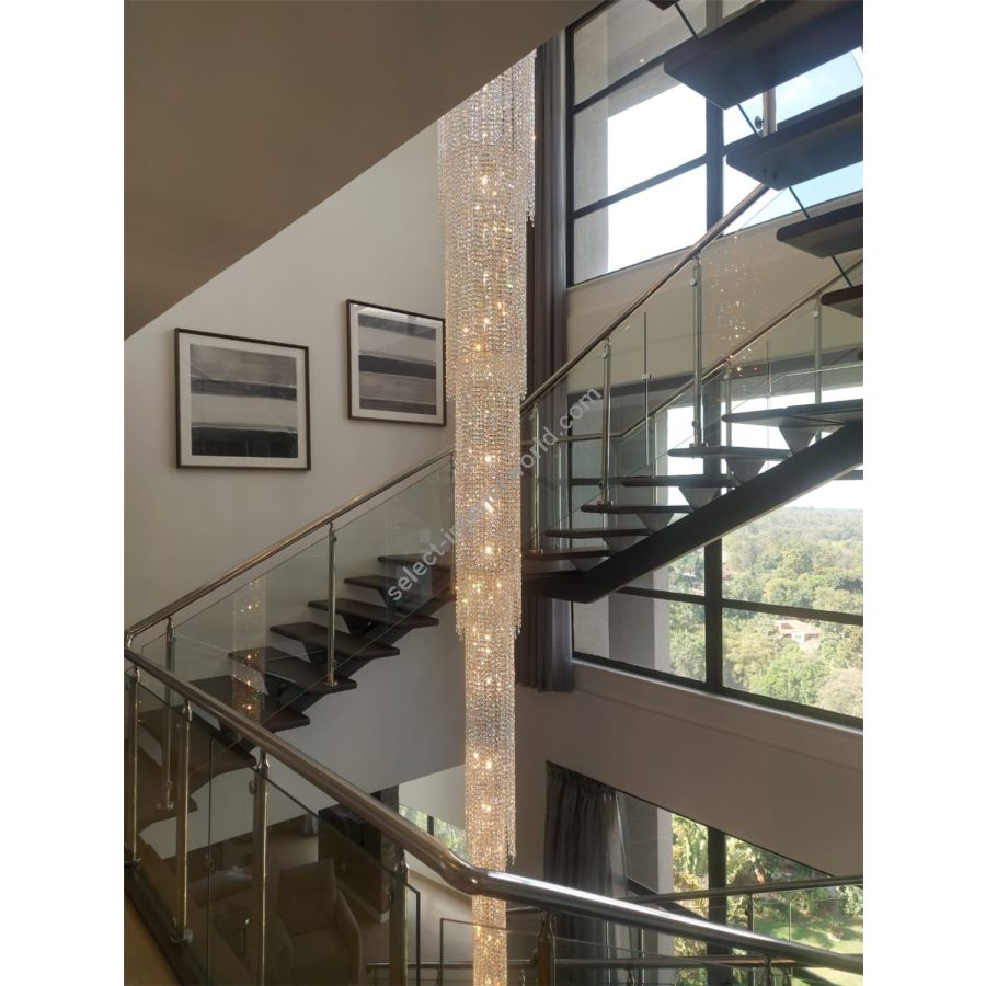 The Fjord crystal chandelier captures the serene beauty of the Nordic landscape, evoking images of sparkling ice and shimmering waterfalls. Inspired by the organic formations of Nordic fjords where icy cliffs meet calm seas, this handcrafted crystal chandelier brings a sense of natural harmony and elegance to living spaces. Fjord’s unique vertical arrangement distinguishes it within the Manooi range, making it an ideal choice for interiors with high ceilings, such as staircases, lobbies and atriums. Whether used as a striking solitaire or in a group installation, Fjord adapts to minimalist and luxurious settings alike. Part of the Manooi luxury lighting collection, Fjord is offered in multiple sizes and crystal color options. Fjord crystal chandelier is highly customizable, with bespoke options available upon request, making it a versatile lighting solution for residential, commercial, or hospitality environments. In addition to our standard premium crystal selection, Fjord chandelier is available with 100% Swarovski® crystals.