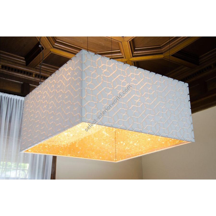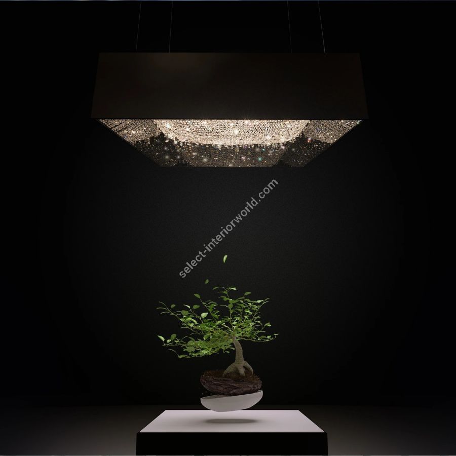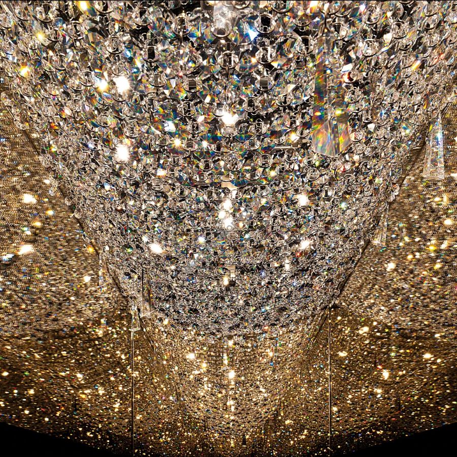 Deep Sky is an attempt to grasp the infinity of space, composed of crystals augmented by their own reflections. This endless mass of twinkling stars is only visible from below, within the solid mirror box structure concealing a sparkling multitude. Available in 18 standard sizes for different architectural spaces, Deep Sky is the most versatile and popular chandelier in the Personal Universe Collection.