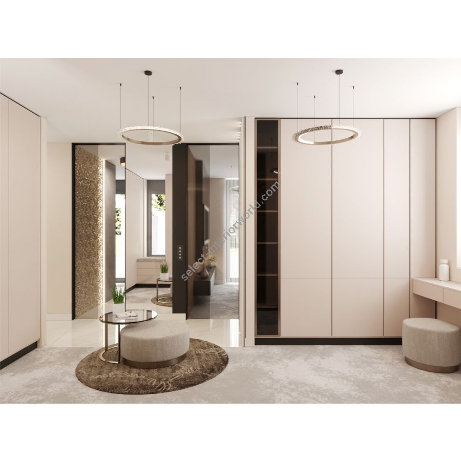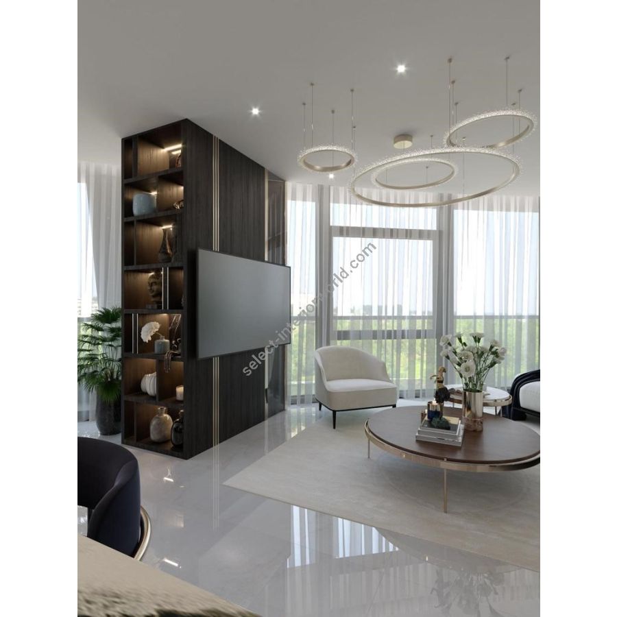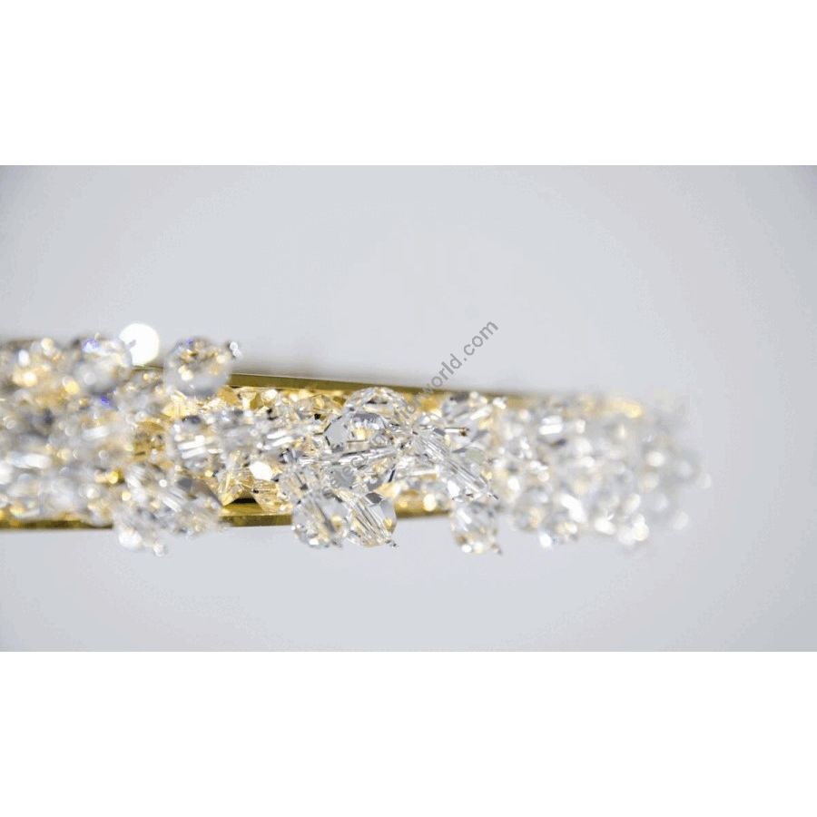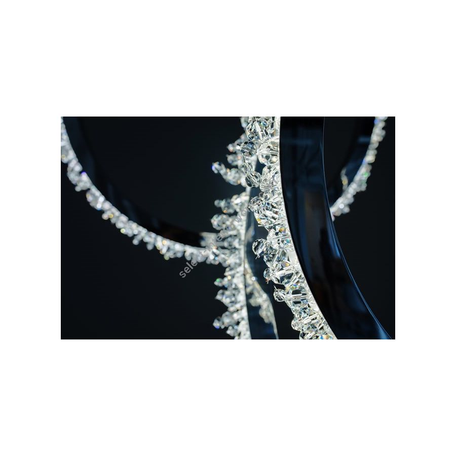 Halo crystal chandelier, inspired by the radiant glow of celestial bodies like the sun and moon, is designed to refract light with the brilliance of ice crystals in the atmosphere. Crafted with minimal materials and the precision of a handmade crystal chandelier, the Halo crystal lamp feels both weightless and substantial, as an embodiment of refined simplicity. Its crystals are arranged into delicate branches that resemble frosted rays, scattering light into a cascade of sparkles and creating a warm, radiant glow. This minimalist crystal chandelier invites viewers to experience the beauty of pure light. With its contemporary silhouette and clean geometry, this modern crystal lamp integrates effortlessly into both classic and modern interiors. The Halo chandelier can be installed vertically or horizontally, displayed as a single statement piece or in clusters, offering limitless versatility in luxury design settings.